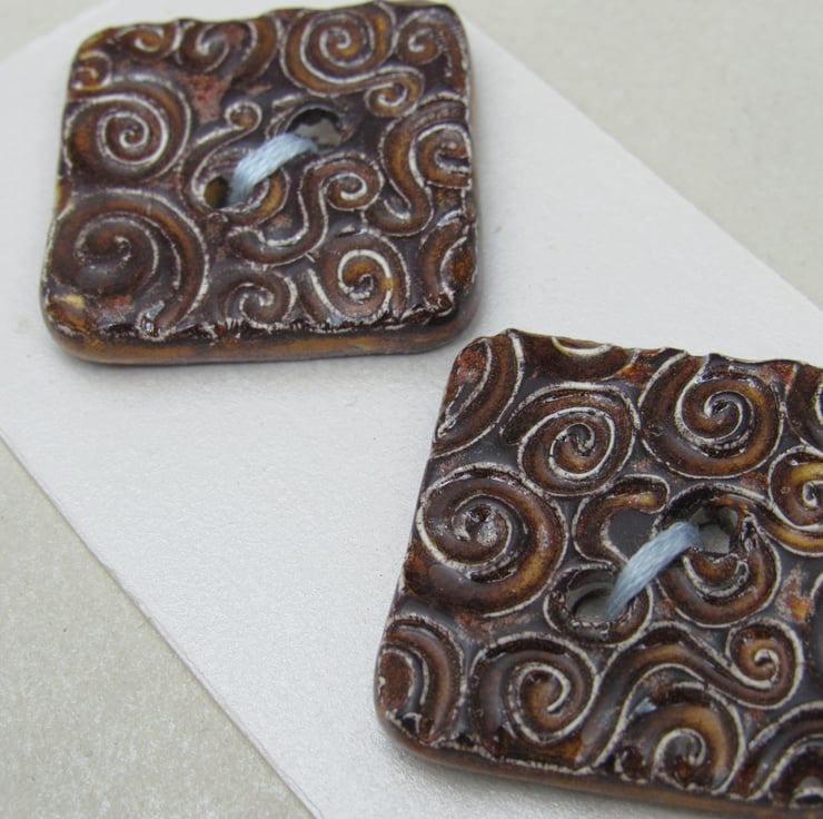 2 medium-large earthenware buttons, textured with jaunty spirals and finished with a glossy dark copper brown glaze with bright highlights