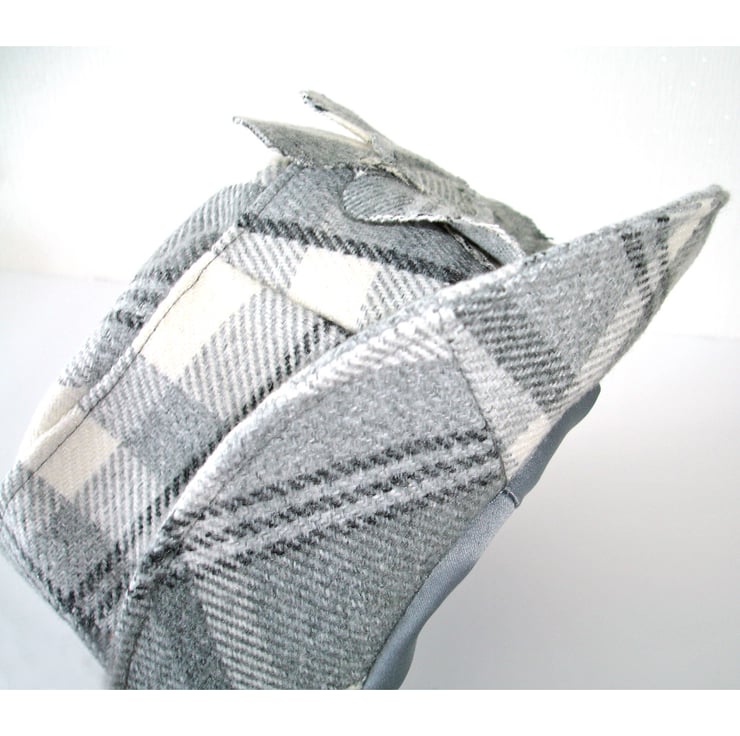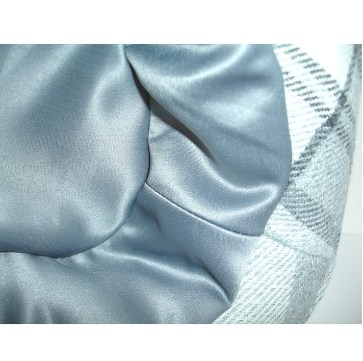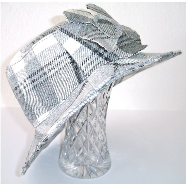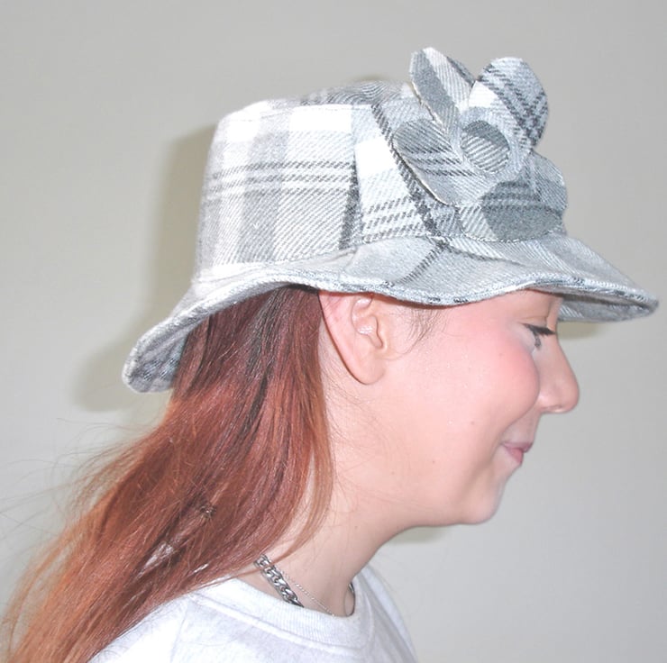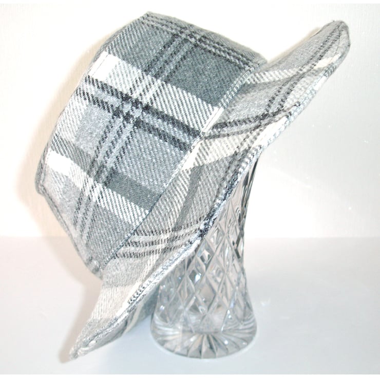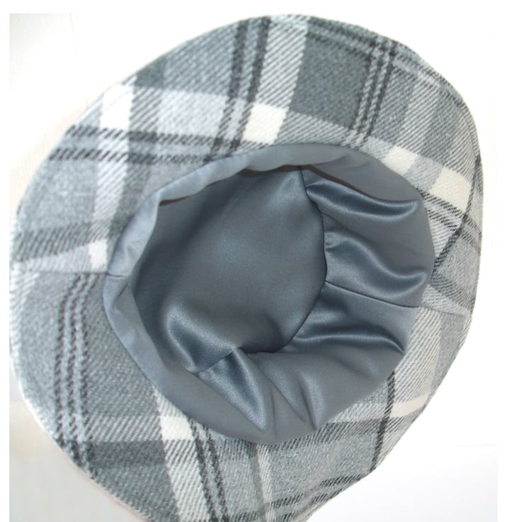 A Hat made with a wool feel fabric - tartan plaid grey and cream