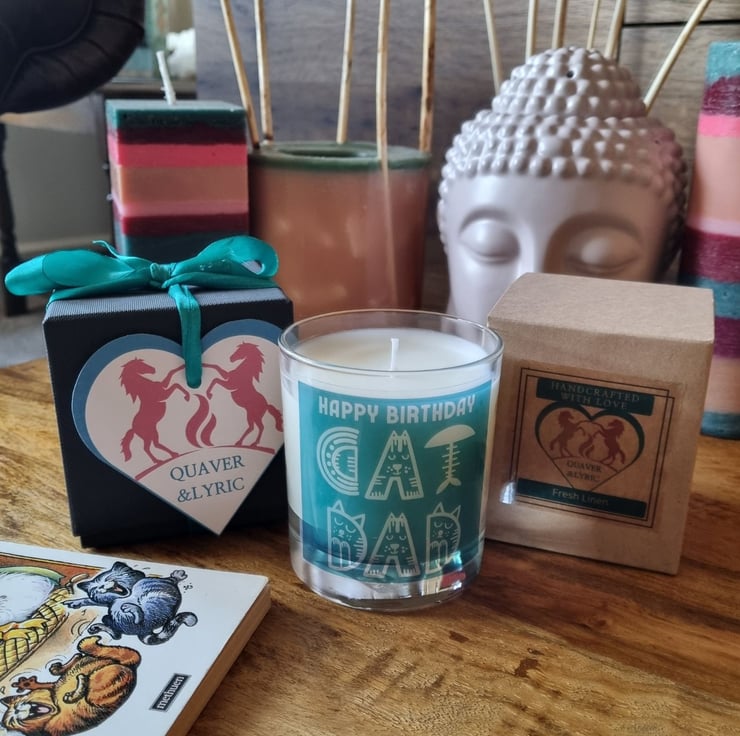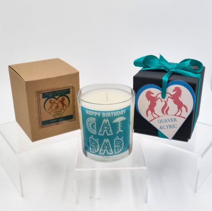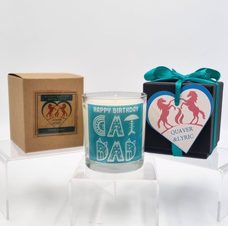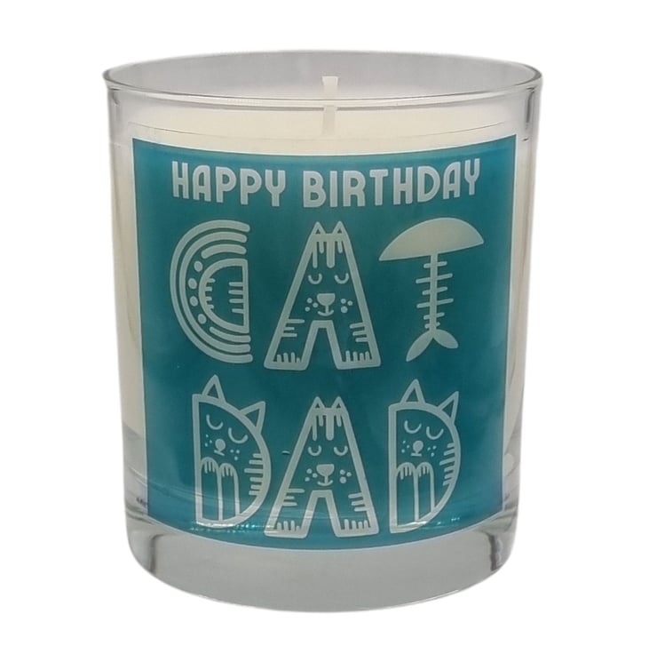 A beautifully scented candle with Dad cat design and the message Happy Birthday. Handmade in Northamptonshire using a responsibly sourced soy wax, the finest range of premium fragrances, hand-poured into quality glass containers and supplied in a kraft box. The design on the scented candle is made from permanent printed waterproof vinyl which can be cleaned (hand wash only) allowing the glass to be re-purposed as part of your home decor after the candle has burned.