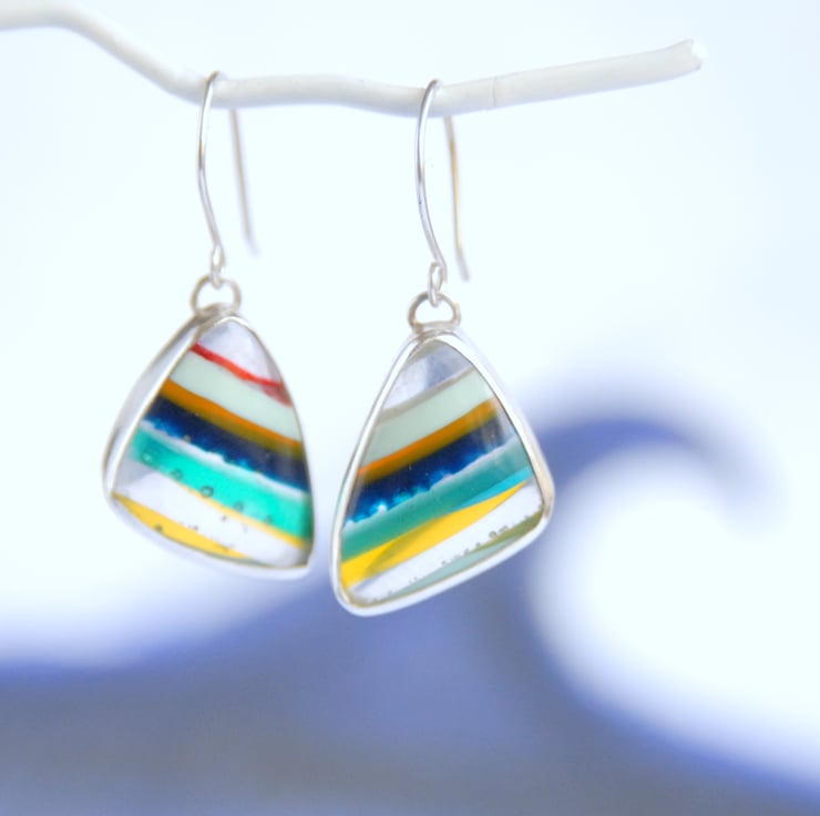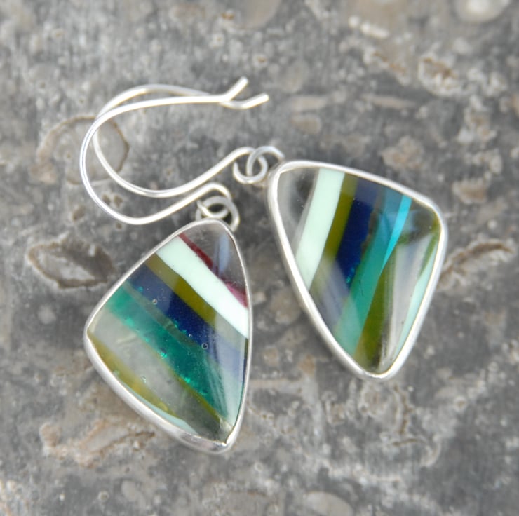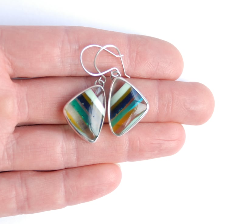 These summery surfite earrings feature triangular pieces of striped Cornish surfite which has been smoothly bezel set in sterling silver and finished off with sterling silver hooks. The surfite has diagonal stripes in shades of blue, aqua, mint and yellow. Some of the bands are opaque but most are translucent and the settings have an open back so light can shine through the surfite if you have short hair or wear it in an up do, this changes the appearance of the surfite as the colours of the translucent bands show up more. These dangly earrings measure 39mm (from top of the hook) by 16mm but surfite is lightweight compared to traditional stones so they are not heavy in the ears. Comes gift boxed.