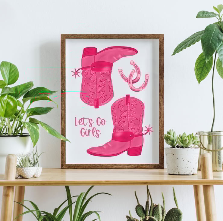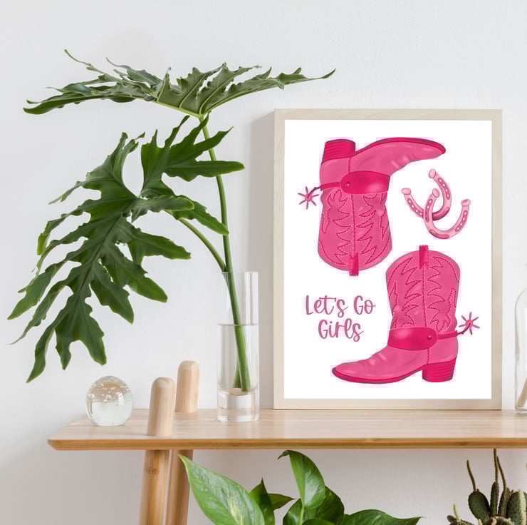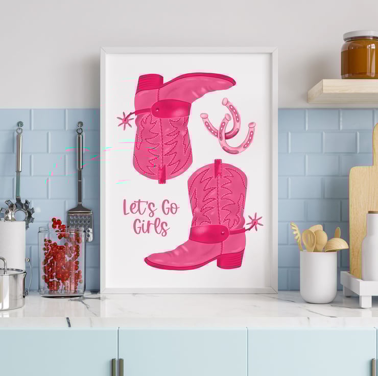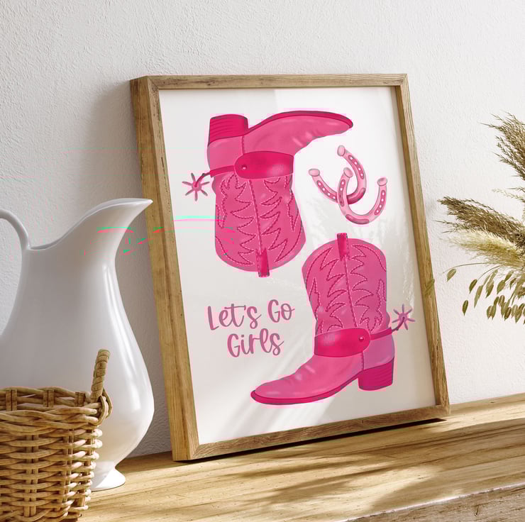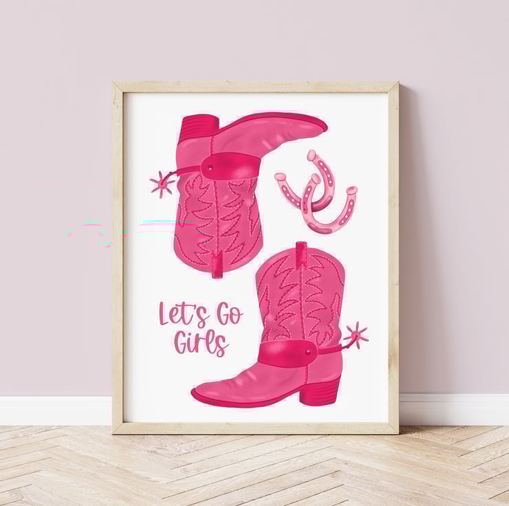 Pink Cowgirl Boots illustrated art print featuring the words 'Let's Go Girls'.