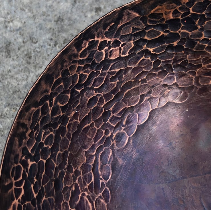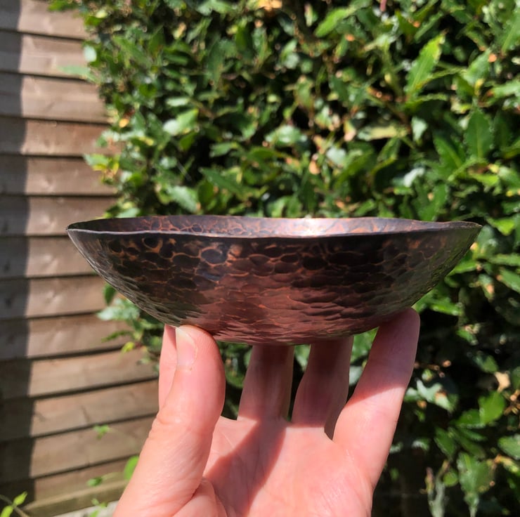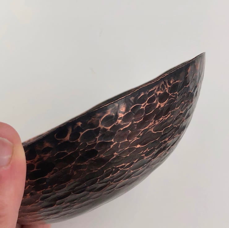 Decorative copper bowl with hammered and oxidised finish. Hand raised copper bowl with beautiful hammered surface. Each piece is unique and has the makers mark on the underside.