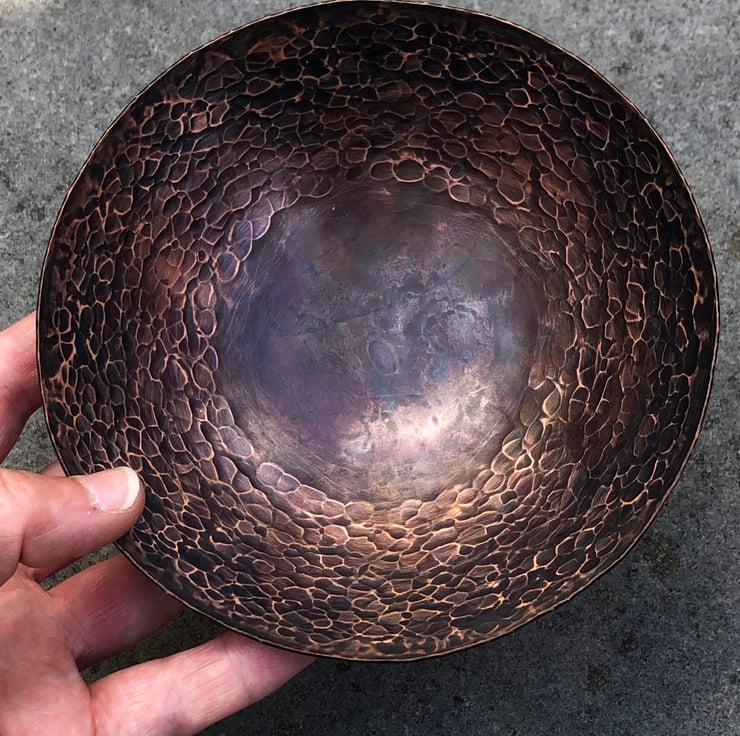 Copper is a wonderful metal to work with due to the amazing range of colours produced during the oxidising process. Oxidising will occur naturally over time and the surface of the bowl will change, which I just think adds to the beauty and tells the story of the users interaction.