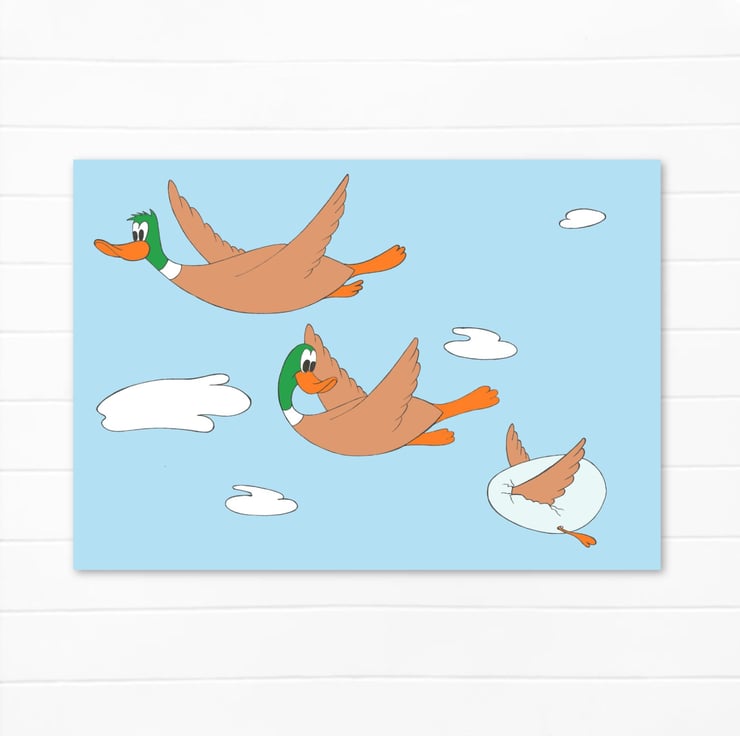 Flying Ducks Greeting Card: Hand Drawn Cartoon Artwork for Any Occasion (201)