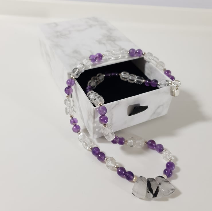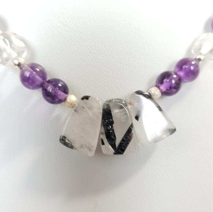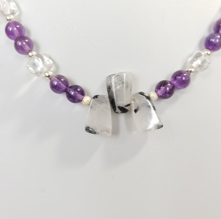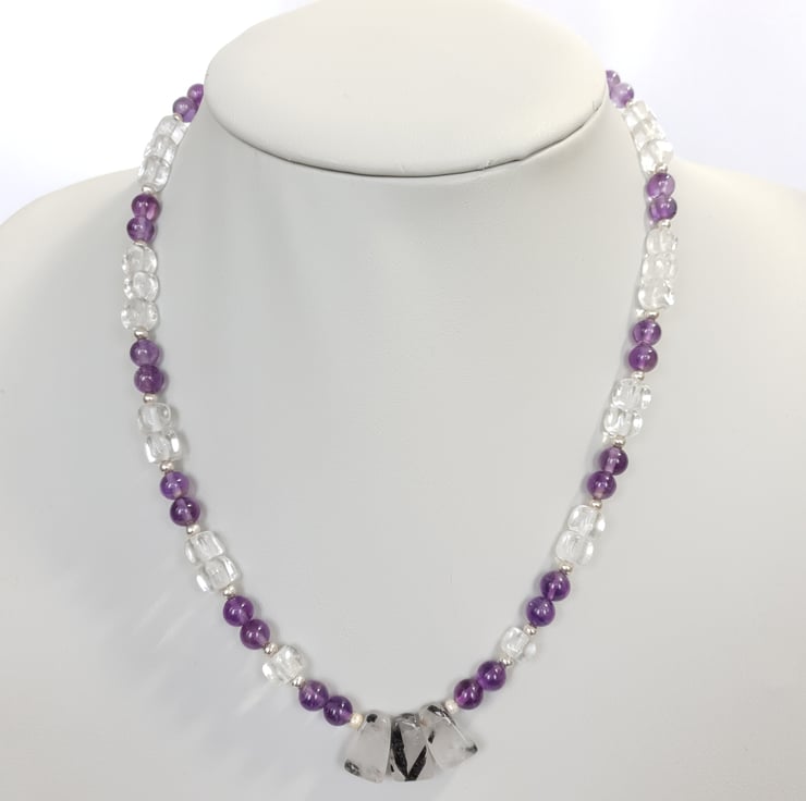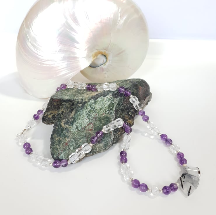 Pretty Gemstone Necklace Amethyst Rock Crystal Rutilated Quartz Sterling Silver