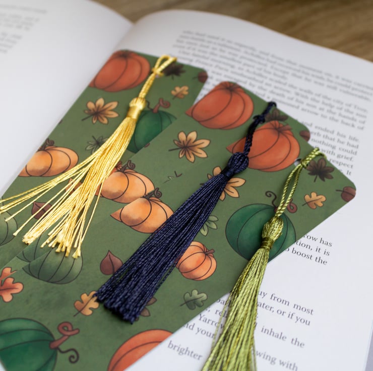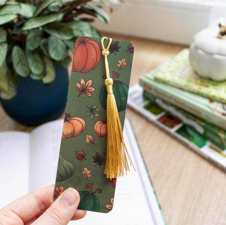 Add some extra autumn cosiness to your reading session with this nature-inspired pumpkin and autumn leaves bookmark with tassel.