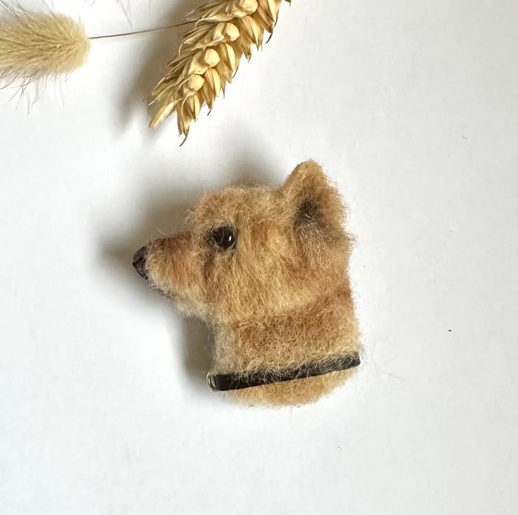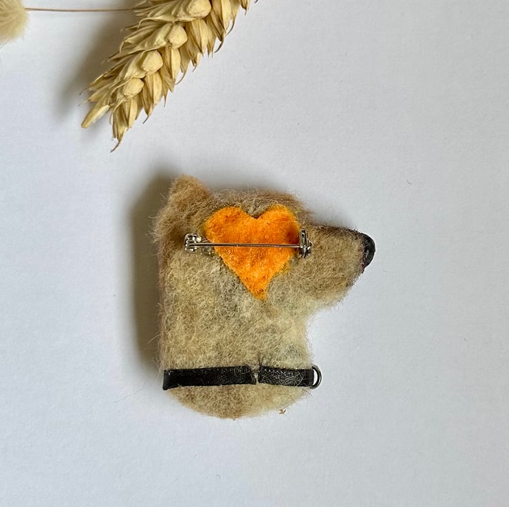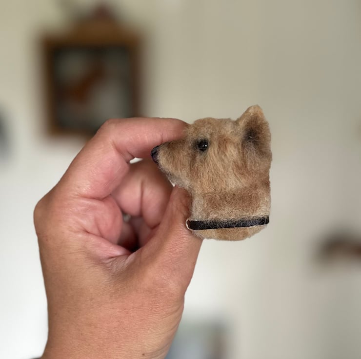 A little hairy terrier type dog head brooch, needle felted from Shetland fleece and local alpaca wool, he has a hand sculpted nose from felters wax.