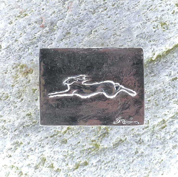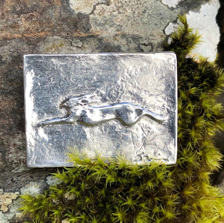 Hare running brooch in pewter by Paul Szeiler.