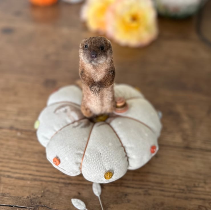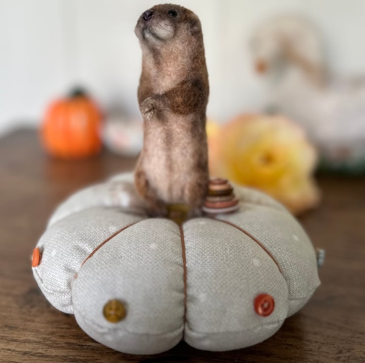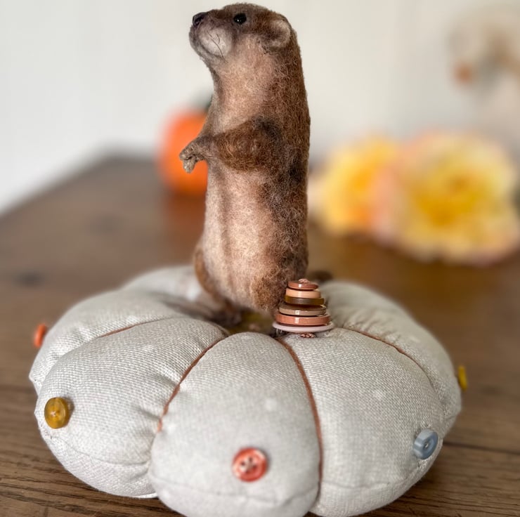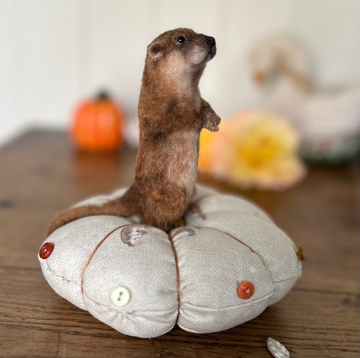 The otter is needle felted from Shetland and Corriedale sheep fleece with hand sculpted beeswax nose, feet and tiny horse hair whiskers. He is standing on the fabric pincushion which he is permanently attached to.