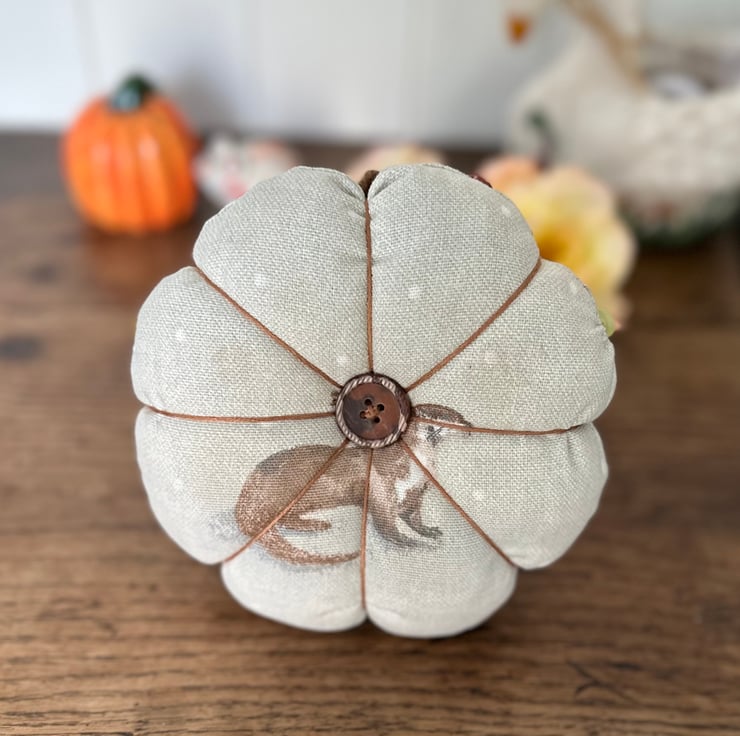 The fabric I have used for the pincushion is an animal kingdom otter natural cotton by fryett’s which is stuffed with clean sheep wool.