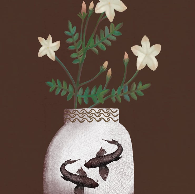 This card has been printed from one of my digital paintings. It measures 12.5x17.5 and is blank inside making it suitable for a number of occasions. It comes with an envelope. It features jasmine flowers in a koi fish vase.