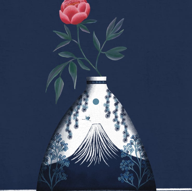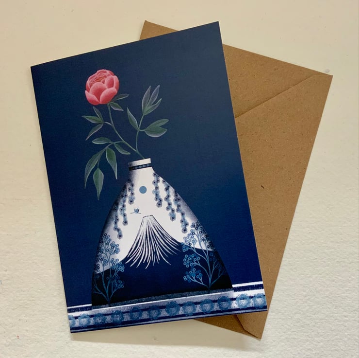 This card has been printed from one of my digital paintings. It measures 12.5x17.5 and is blank inside making it suitable for a number of occasions. It comes with an envelope. It features a peony rose in a Mount Fuji vase.
