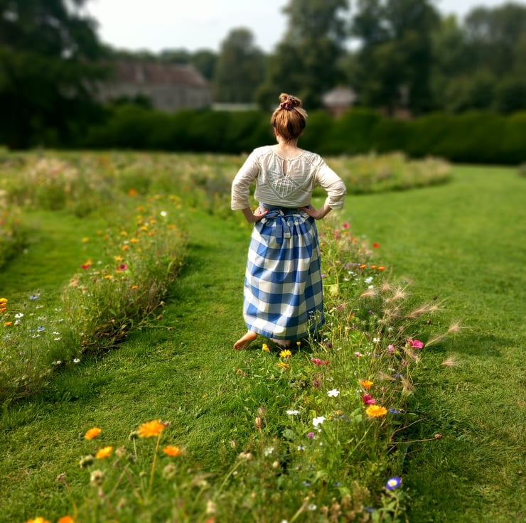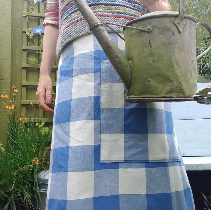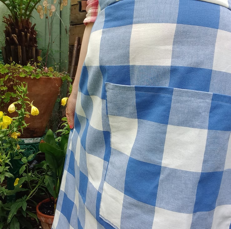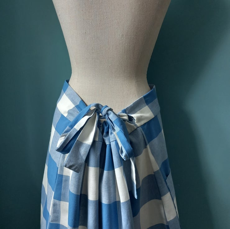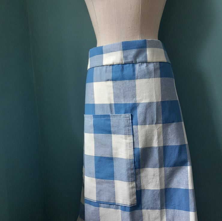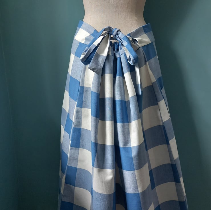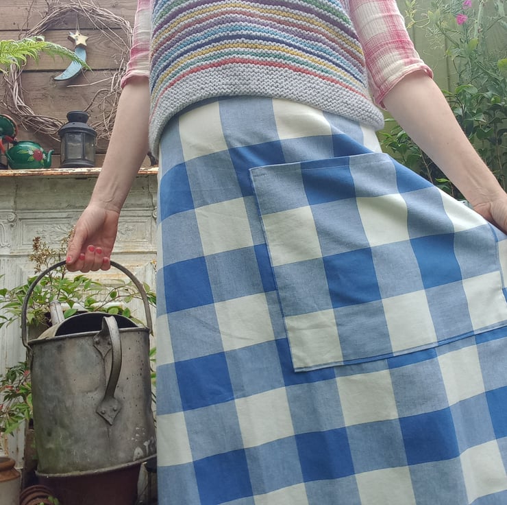 This clever skirt design is neatly made, adjustable waist as pulls together at the back into a gather. Fits from a size 10 to a size 14. with a big over sized pocket and all seems have been overlocked. Beautiful cotton fabric. Feels dreamy to wear especially with a petticoat and boots.