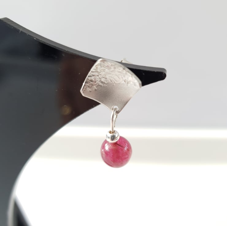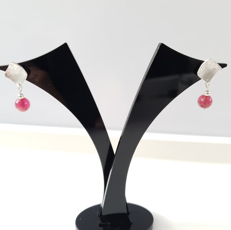Sterling Silver sheet was firstly cut into 1 cm squares and textured on one half of the square by adding a series of small lines and then satinized to create a brushed finish on the other half. The squares were then lightly domed in a doming block to create a concave shape before soldering on Sterling Silver earring posts. Raspberry pink quartz beads were then added to enhance the design.