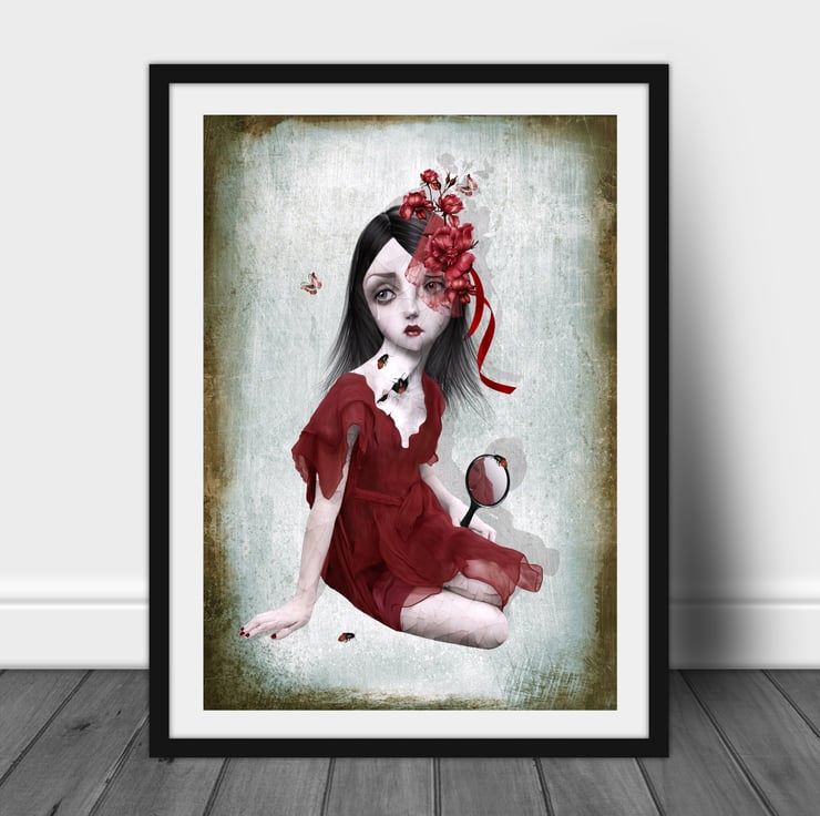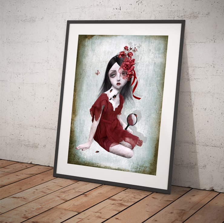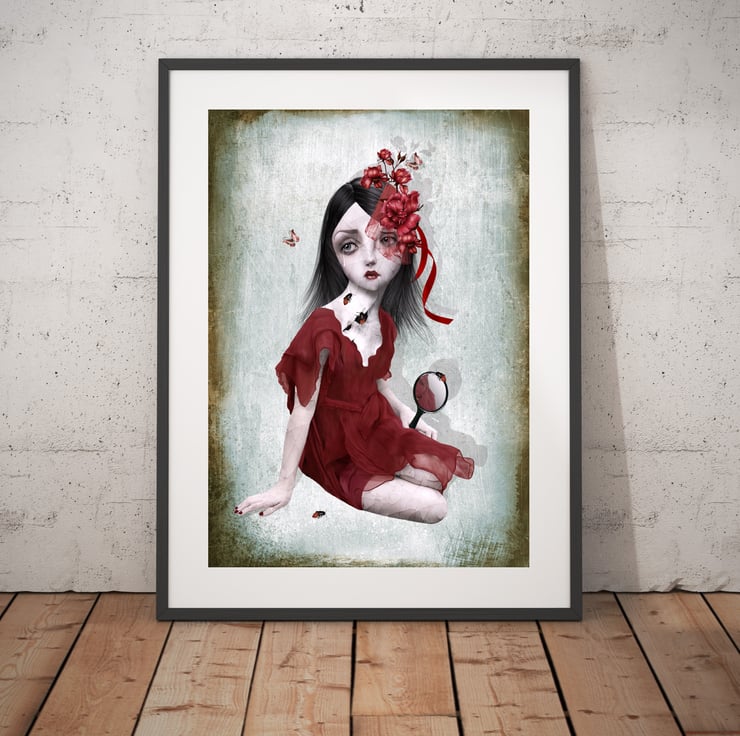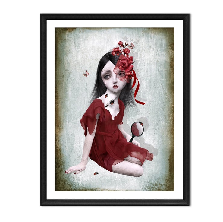 A sad girl with porcelain skin bears deep cracks, from which dark insects emerge, revealing the hidden turmoil within. Her delicate features contrast with the unsettling presence of the crawling bugs, symbolizing inner fragility and sorrow. This art print captures a haunting portrayal of beauty intertwined with darkness.