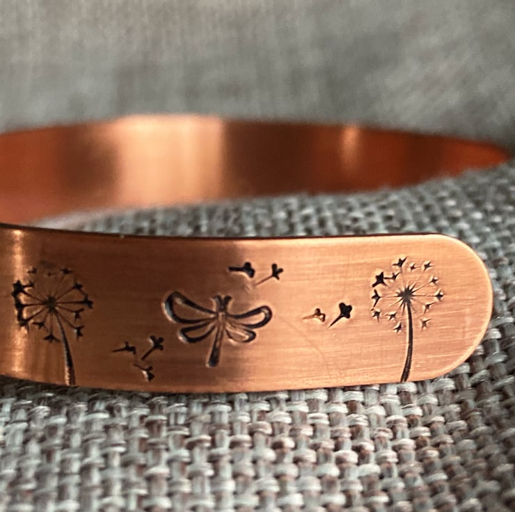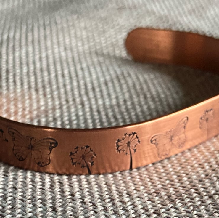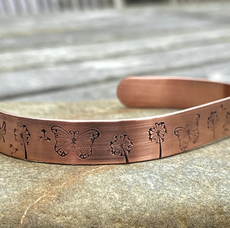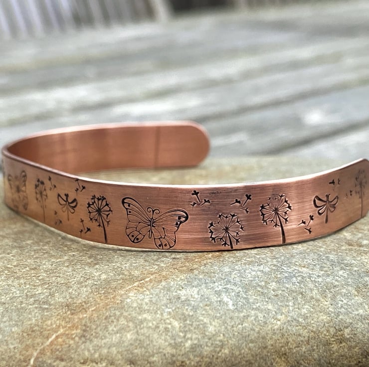 Copper Cuff Bracelet featuring Dandelion clocks, Butterflies and Dragonflies. Measures 152mm x 9.5mm and is adjustable to a range of wrist sizes. Colour aged with a patina, the bracelet has been polished and is ready to wear.