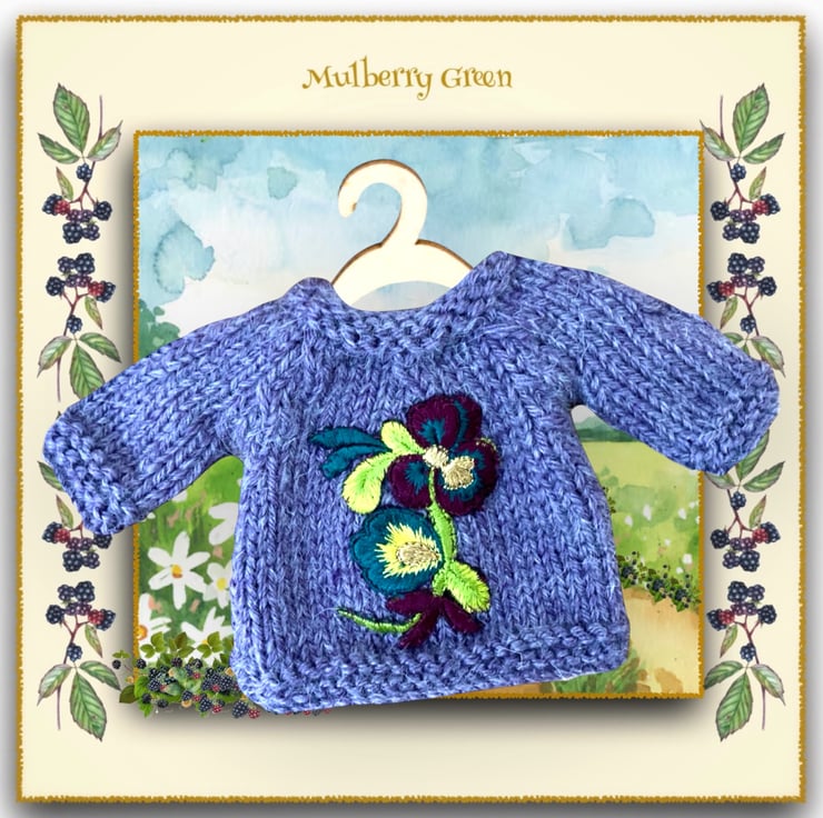 A lovely lavender jumper, decorated with embroidered violets, to fit the Mulberry Green characters. The jumper is hand knitted and fastens with a little popper at the back.