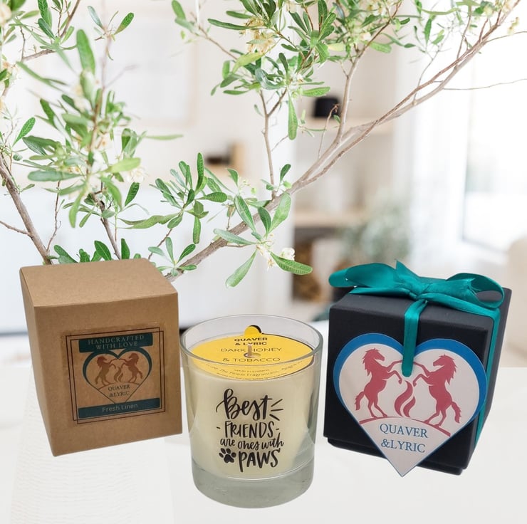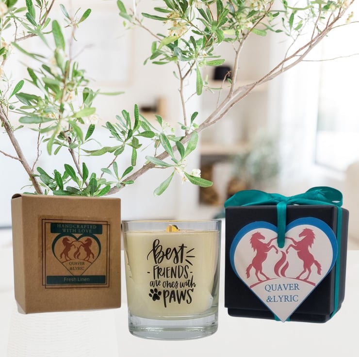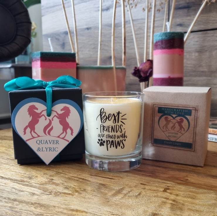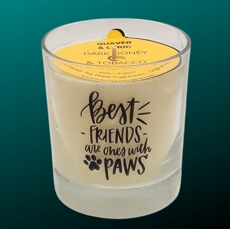 A beautifully scented candle with the motto Best Friends Are Ones With Paws. Handmade in Northants using a quality rapeseed and mineral wax blend and premium fragrances, hand-poured into quality glass containers and supplied in a kraft box. The design on the scented candle is made from permanent printed waterproof vinyl which can be cleaned (hand wash only) allowing the glass to be re-purposed as part of your home decor after the candle has burned.