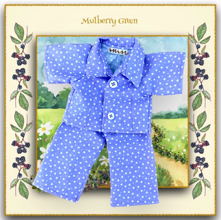 A cute little pair of lavender pyjamas, in a little stars print, to fit the Mulberry Green characters. The pyjamas are made from best polycotton and are tailored like real pyjamas. They fasten with poppers under two little buttons.