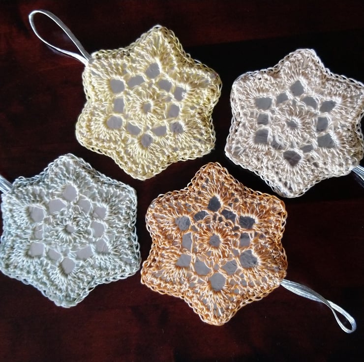 Hanging decorations to go on your Christmas tree, or elsewhere. Set of four, each one is made of two hand crocheted star motifs. Between them are two layers of card covered in foil, so the foil shows through the lacy parts of the motifs and gives a sparkle to the decoration. Great if near a light on your tree (but do not let them touch the light) The hanging loop is attached with a staple (sandwiched between the two layers of card inside the decoration) and is of a silver elastic, so has a bit of stretch for hanging on awkward tree branches.