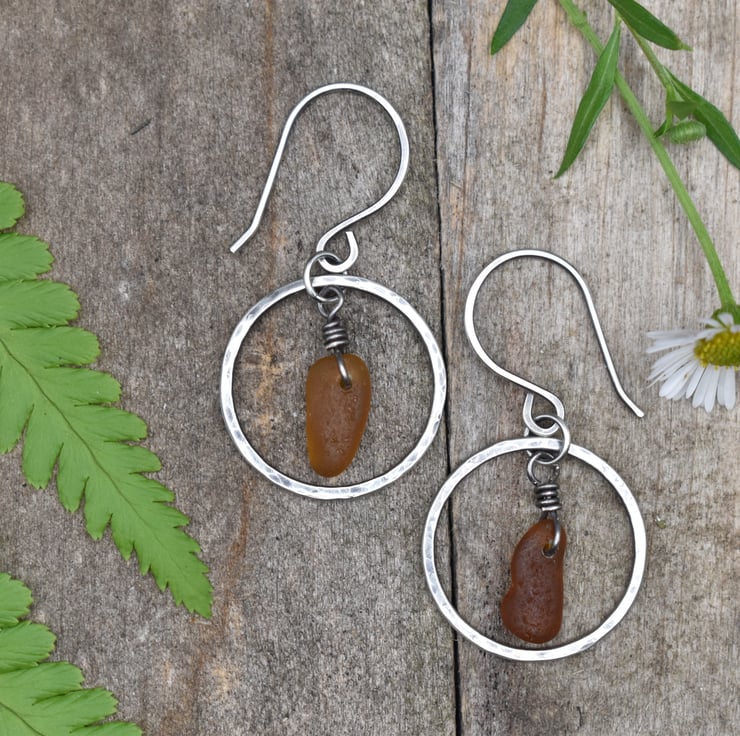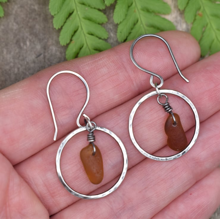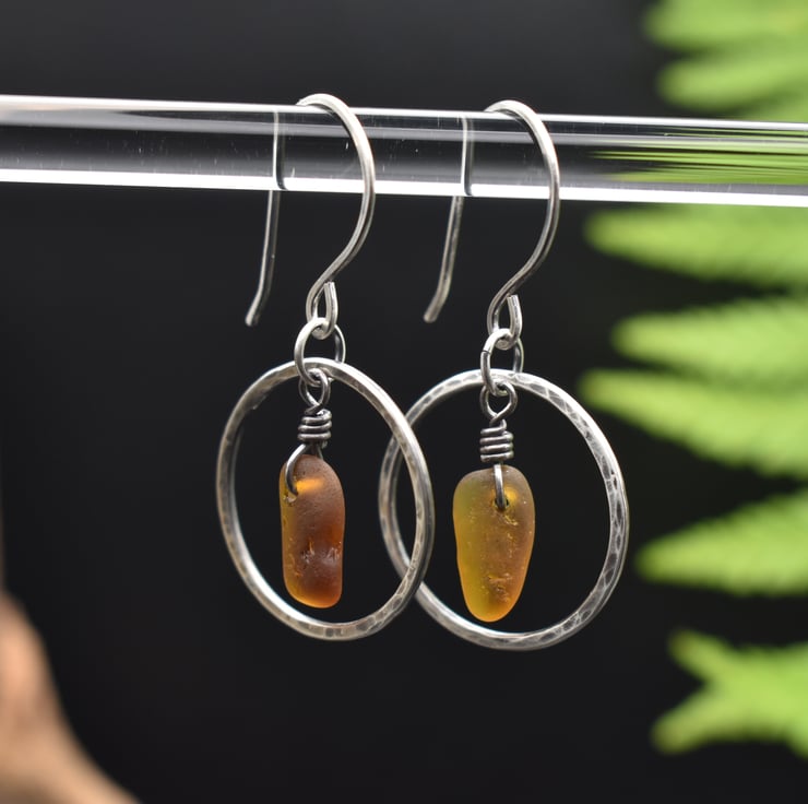 These earrings have been made using recycled sterling silver, and sea glass collected from a local Highland beach. Each earring features a small piece of amber sea glass suspended in the centre of a handmade, textured sterling silver 925 hoop. They measure just under 4cm from the top of the hook, and have a 'dangle length' (from the bottom of the hook) of around 2.4cm. The sterling silver components have been oxidised using liver of sulphur to give an antiqued finish.