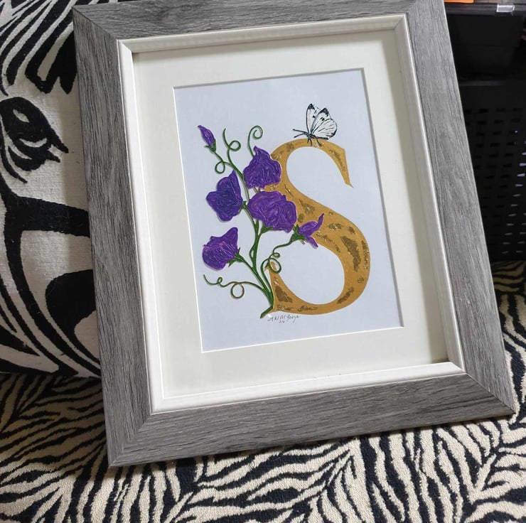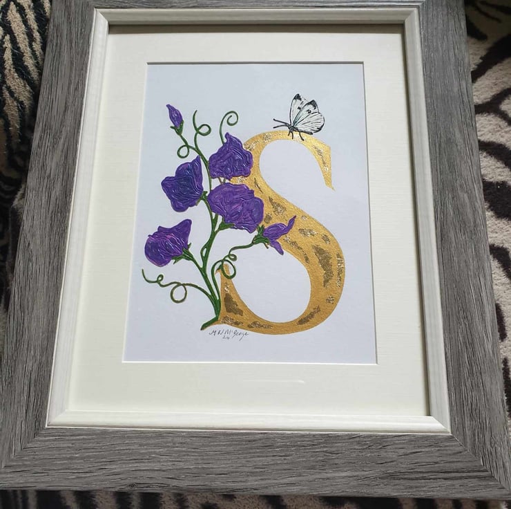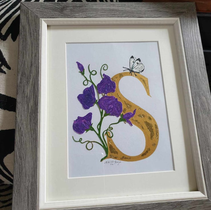 An Exquisite Original Collage And Mixed Media Picture With The Uniquely Quirky 'S' Is For Sweet Pea With White Butterfly, The Design Done In Hand Painted And Collage Show A Gold Guilted 'S' With Purple Sweet Peas Climbing Up The the 'S' And Accompanied By An Inquisitive White Butterfly Which Has Landed On The Top Edge Of The 'S', The Picture Is Framed In A Grey Birch Coloured 32.5cm x 28cm Frame, The Frame Colour Enhances The Beauty Of the Art Work And realism Of the Subject, Which Is lovingly Created For Your Enjoyment Also Prices Reflect The Hours Of Creating This Unique Art Piece And Quality Of Materials Used.
