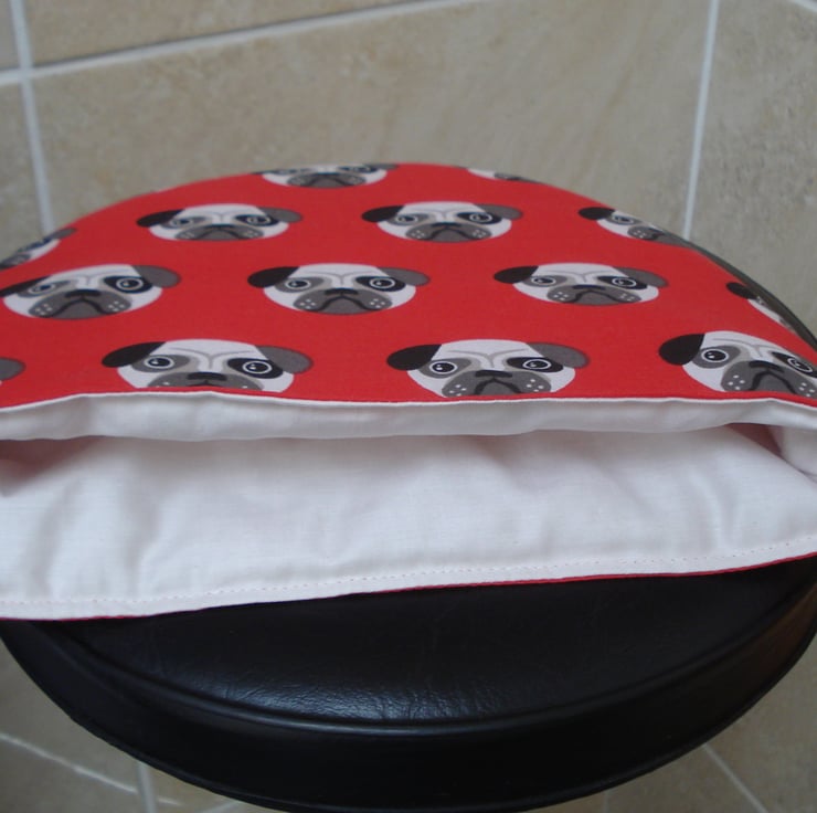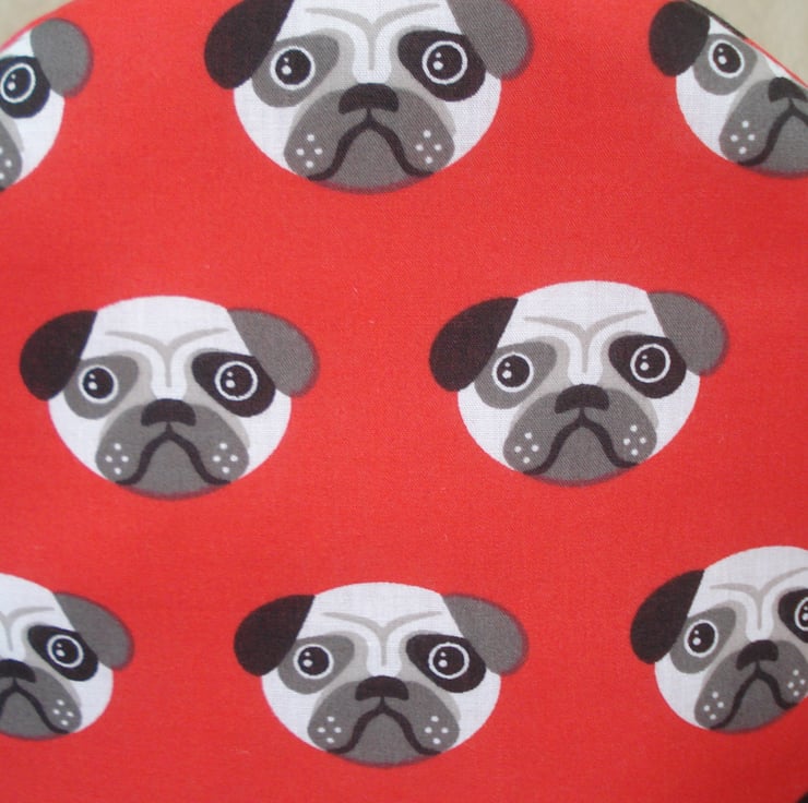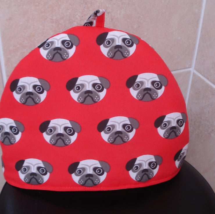 This is a 2-4 cup hand sewn tea cosy. The fabric is a brick red with pug dog faces. The lining can be pulled down to wash and there is a tab at the top for hanging up.
