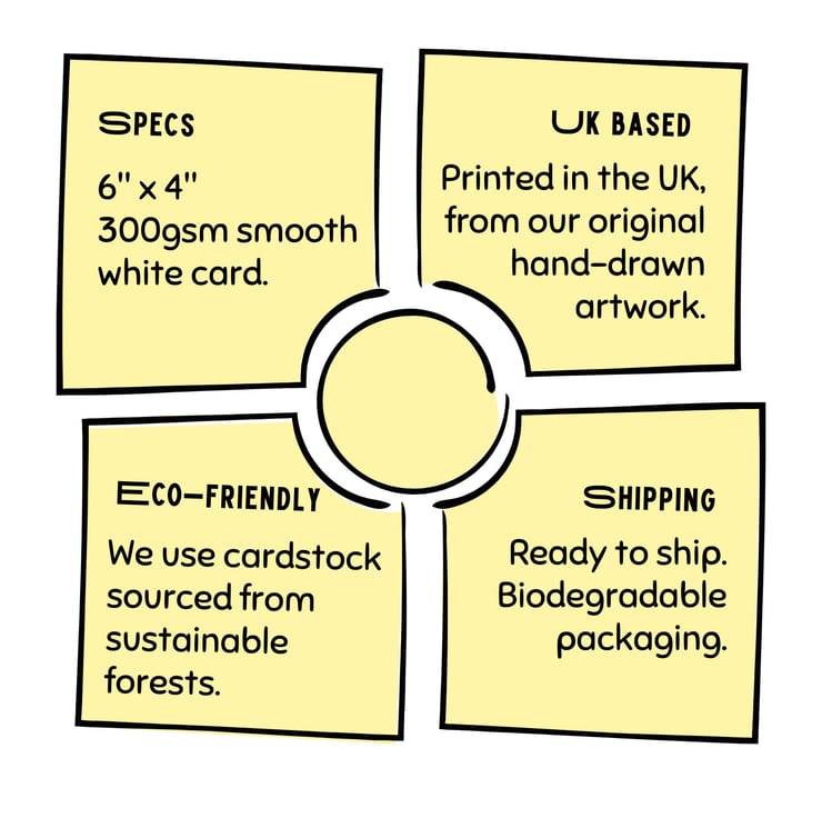 Professionally printed on 300gsm smooth white card in the UK, on board from sustainable forests.