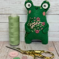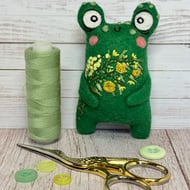 Miniature needlefelted art doll with yarn covered wire horns. This Creature is a mix of dragon and bat with free motion embroidered felt wings and bejewelled horns. It has hand sewn pearly beads from its tail to its head and has glass eyes. This Guardian measures roughly 15cm tall and comes with a transparent loop hanger. This is for decorative purposes only and not a toy.