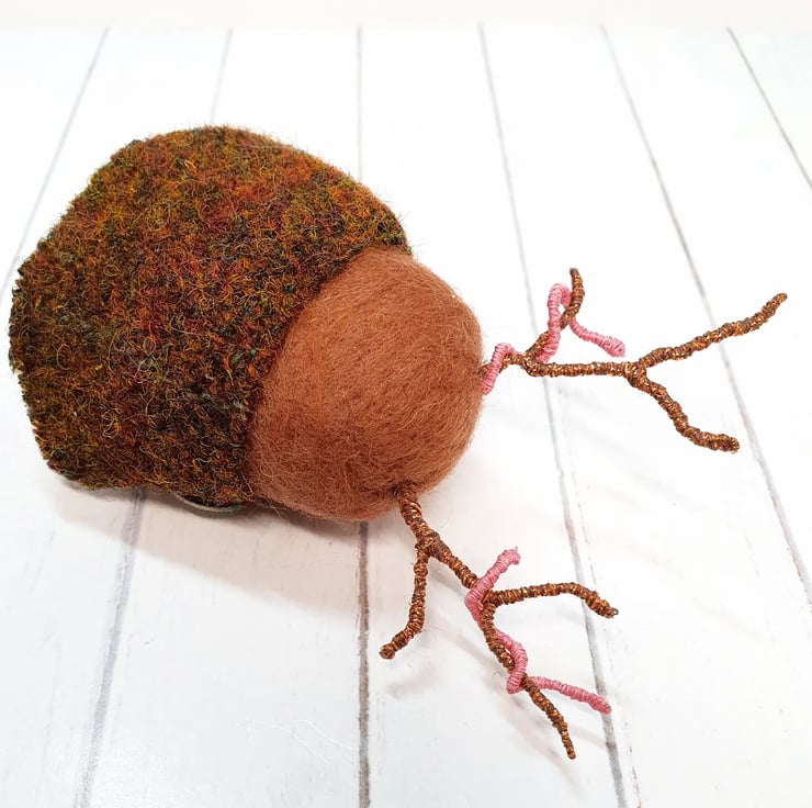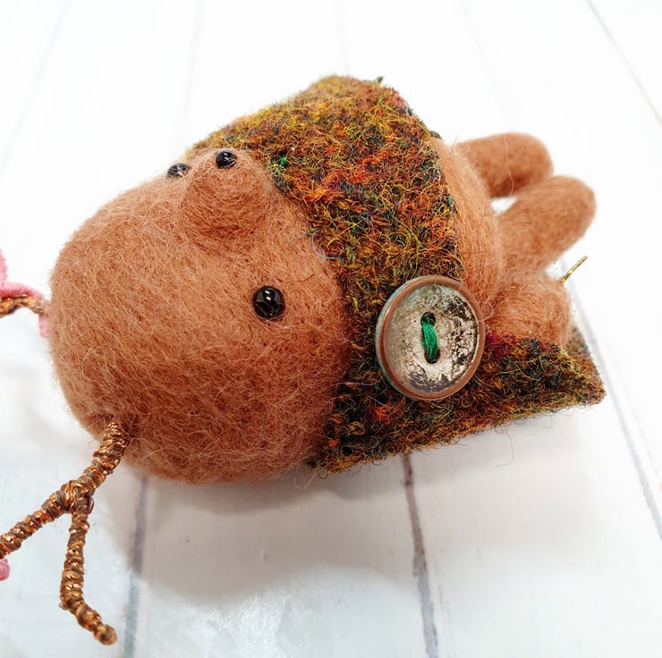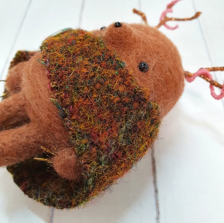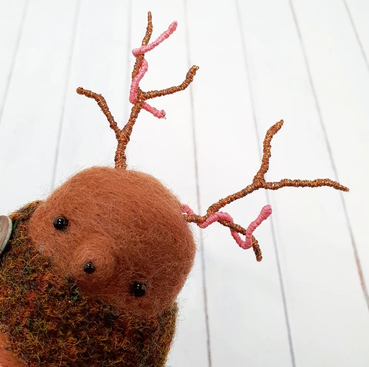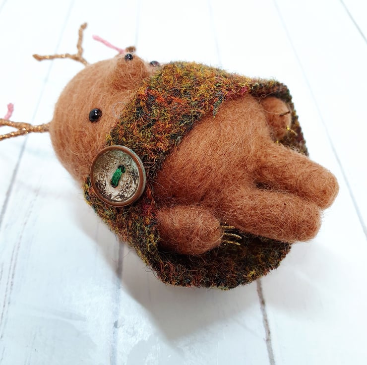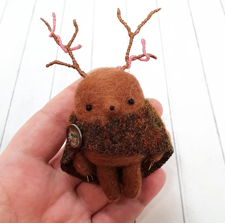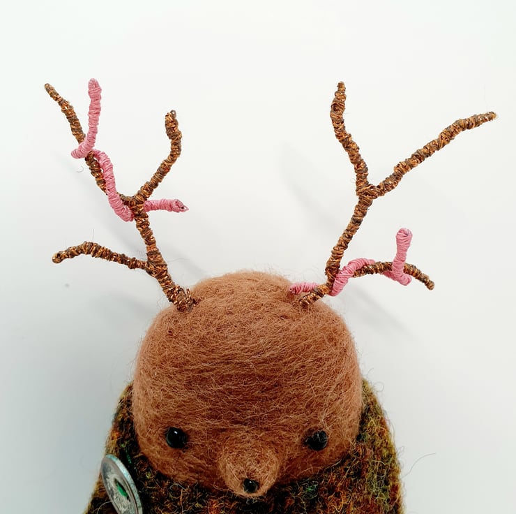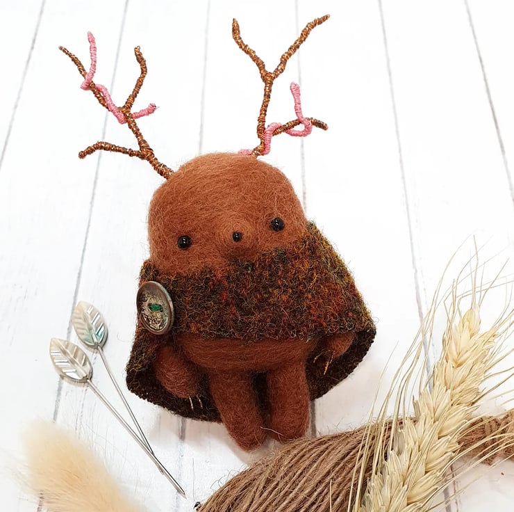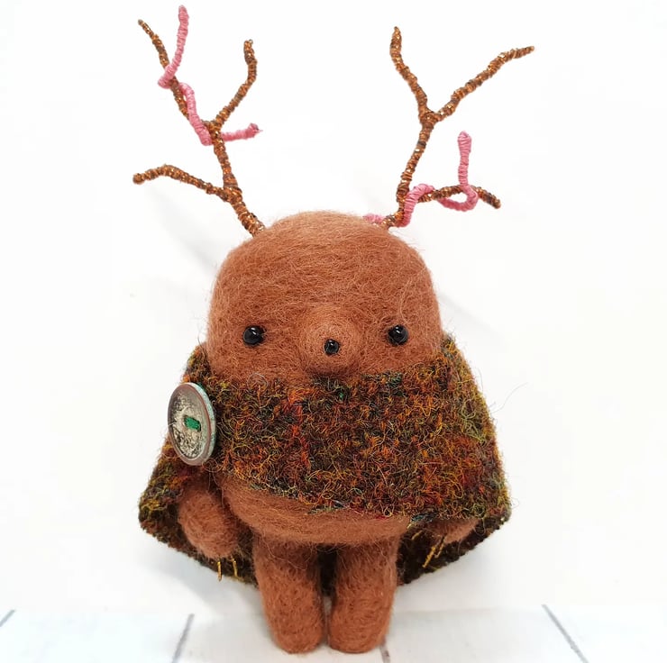 Miniature needlefelted art doll with metallic embroidery thread covered wire antlers. This Creature is a mix of Mole and Deer and wears a woven cloak which is sewn into place and decorated with an aged button. This creature has tiny glass bead eyes and nose and golden wired claws. This Guardian measures roughly 11cm tall and comes with a transparent loop hanger. This is for decorative purposes only and not a toy.