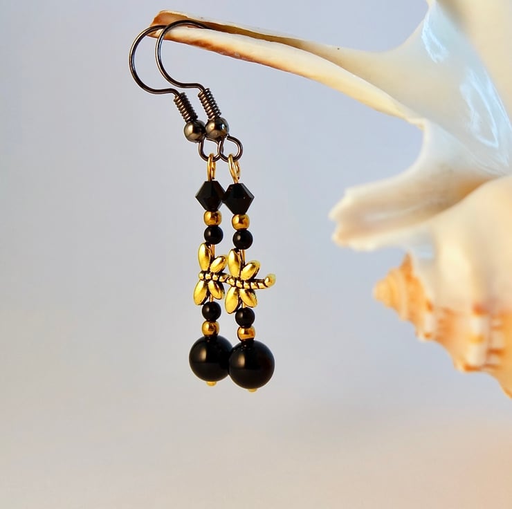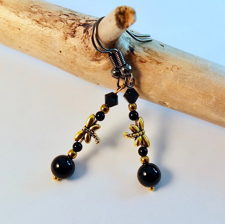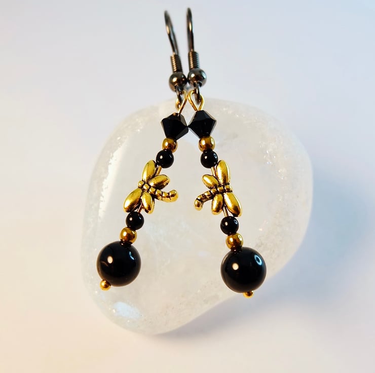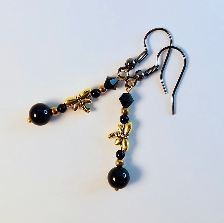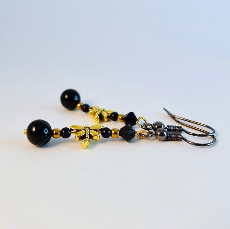 Each earring features a 6mm black Onyx bead topped with an 8mm Tibetan style dragonfly bead in an antique gold finish, highlighted with 2mm black Onyx and 2mm golden Hematite, and a 4mm quality Austrian crystal in the colour 'jet'.