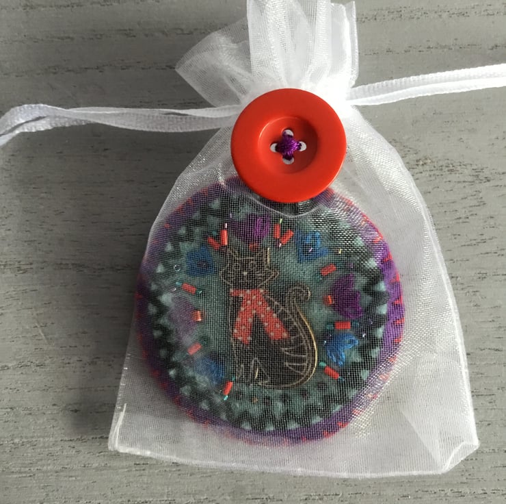 This Hand Embroidered Black Cat Brooch is gift wrapped in an organza bag, decorated with a red button. Also a protective bag to keep the brooch in when not worn.