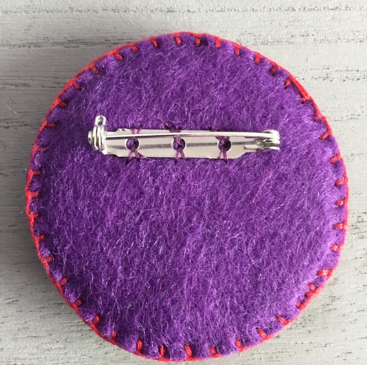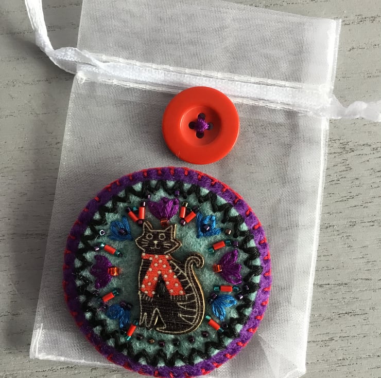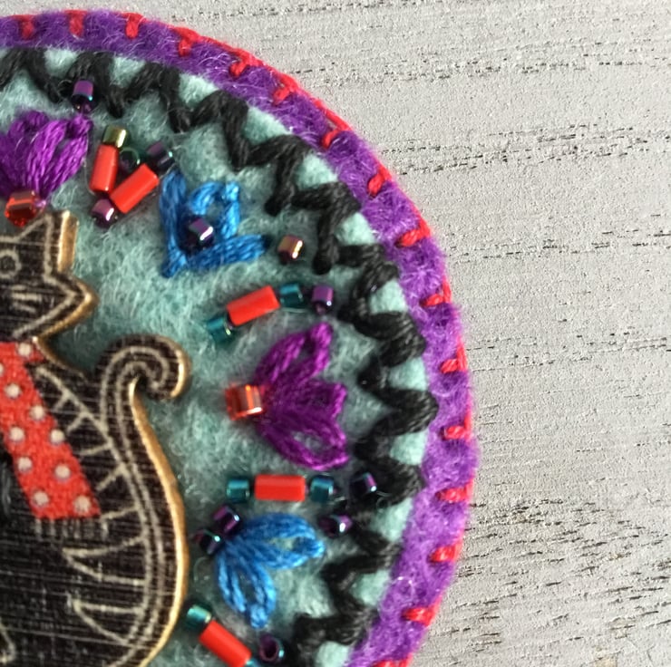 This Hand Embroidered Black Cat Brooch has a wooden Black Cat button stitched on circles of pale blue and purple felt, edged in hand embroidered Fly and Blanket Stitches in black and red embroidery thread. This Black Cat button is surrounded by hand embroidered Lazy Daisy Stitches in purple and blue embroidery threads, with red, blue and purple seed and bugle beads.