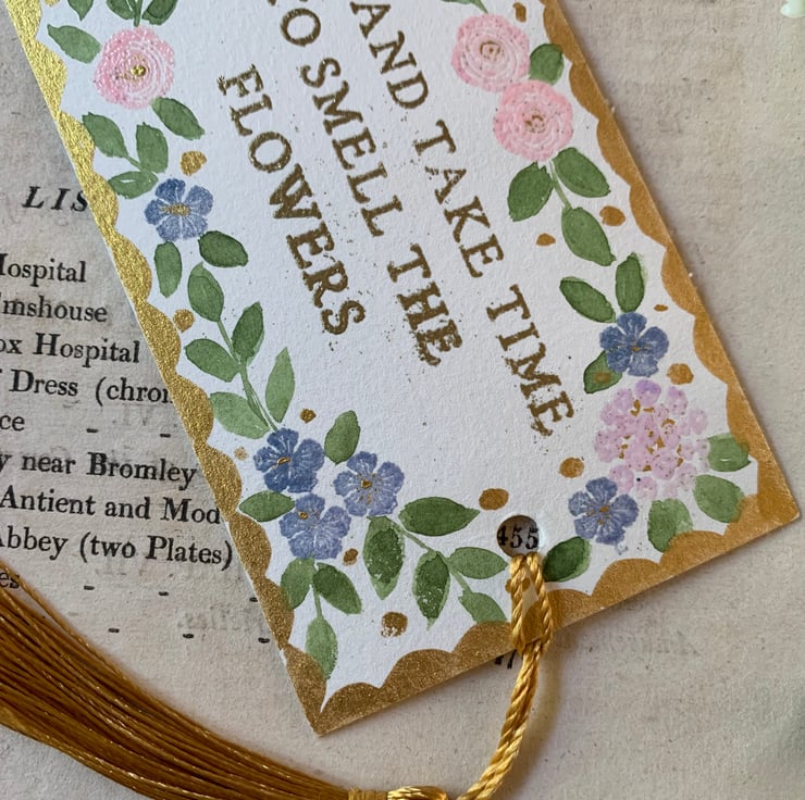 This bookmark has an important message, meant for lovers of flowers or, indeed, for everyone. Take time in every day to slow down, relax even if for just a few minutes, and smell the flowers. Good advice.