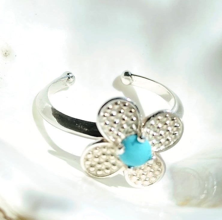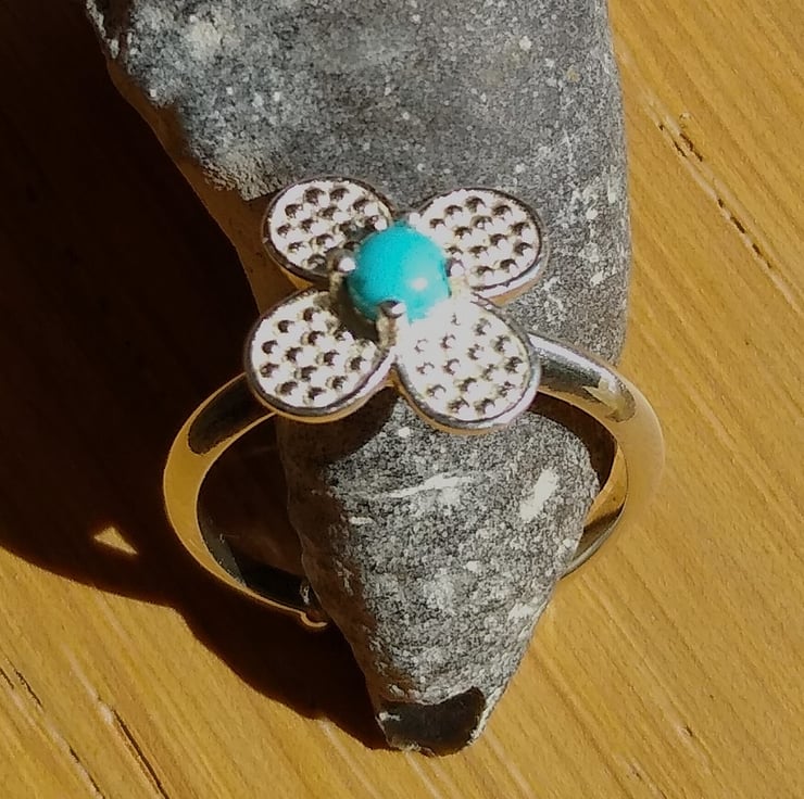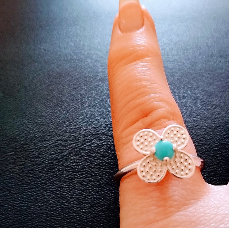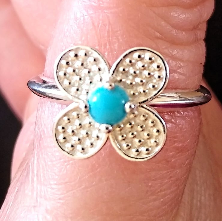 An unusual moving floral ring with a top quality certified genuine 4mm Sleeping beauty turquoise from America, prong set by hand into the centre. The spinning flower has been textured with tiny balls of silver. The ring is open to allow a comfortable fit for a UK size N (US size 6.5, Eur size 53)