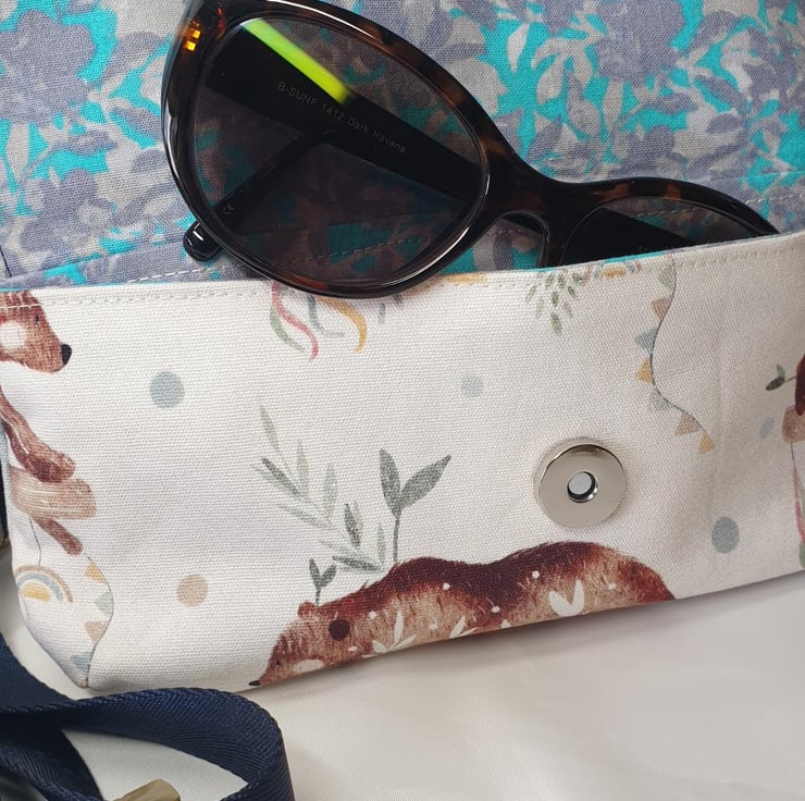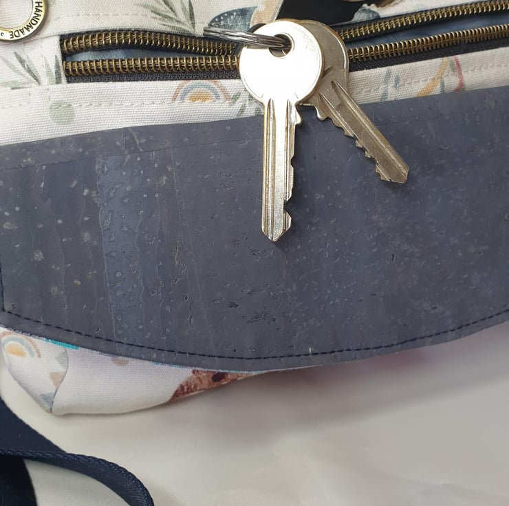 Functional and stylish waist bag /bum bag / hip bag (you know what I mean!). This roomy bag, in water resistant canvas and cork in a cute bear and elephant design has lots of storage detail. The outside features a handy pouch with a cork flap and closes with a magnetic snap. It also has an outer zip pocket and inside, you will find slots for 6 credit cards and another zip pocket. The top of the bag is secured with yet another zip. The adjustable 25mm (1") webbing strap enables you to wear it around your waist or across your chest - all hardware is brushed brass.
