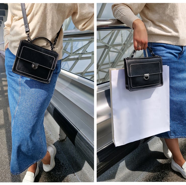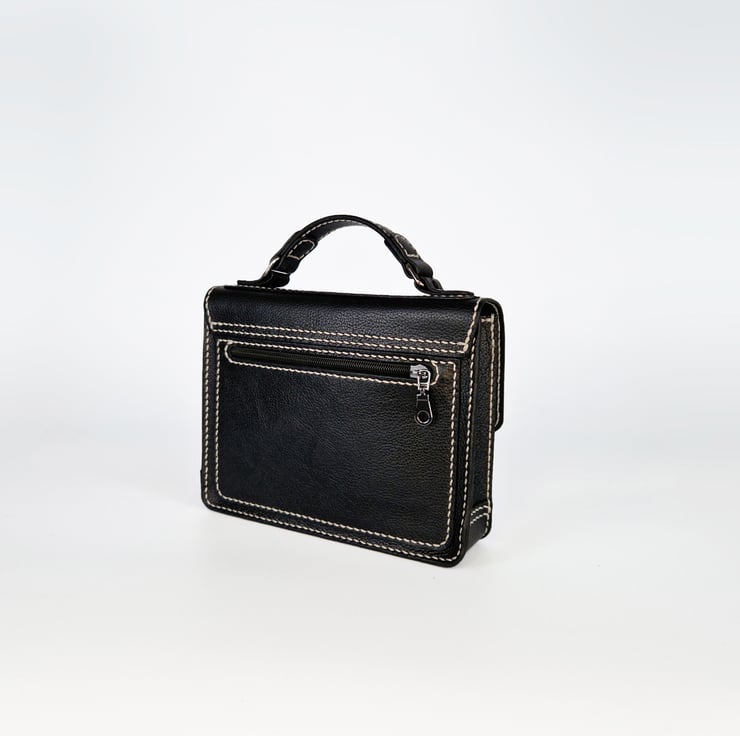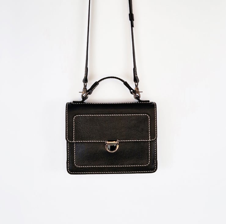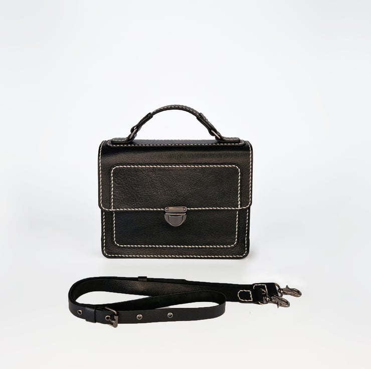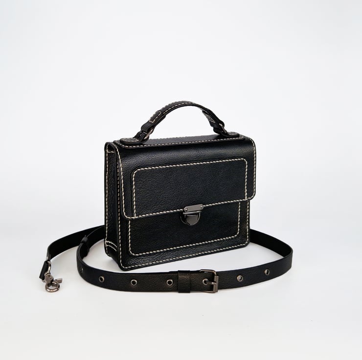 The small black leather bag has white contrast trimming. This bag can be worn as a top-handle bag. The removable, adjustable shoulder strap allows you to wear it as a shoulder or cross-body bag.
