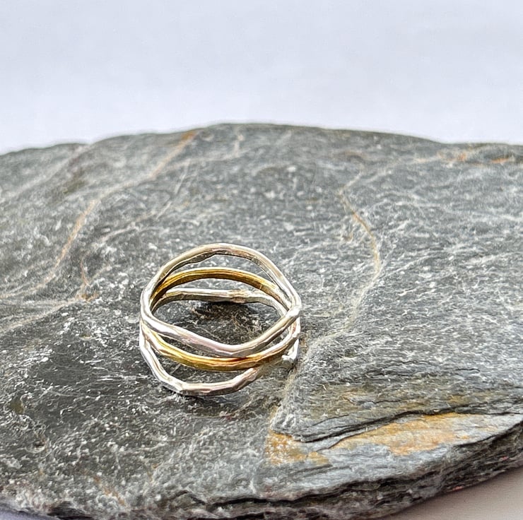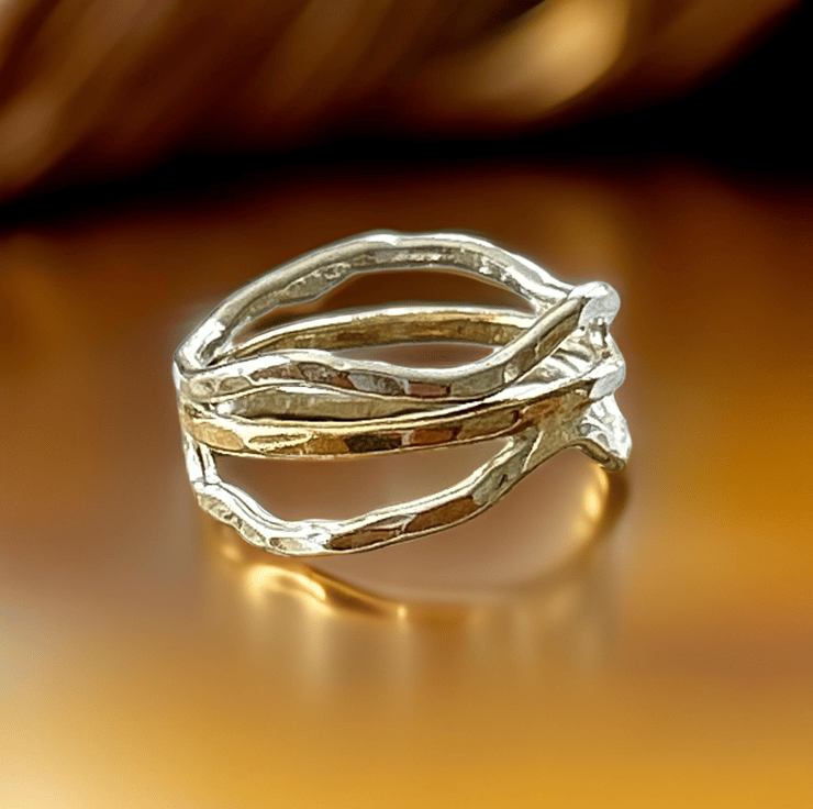 This beautiful artisan-crafted bohemian ring combines the elegance of sterling silver with the warmth of 14ct gold filled, featuring graceful wave shapes that flow along the band. The wave design captures the essence of natural beauty and free spirited-style, symbolising the oceans natural rhythm. The contrast between the polished sterling silver and the luxurious 14ct gold filled creates a stunning visual effect, making this ring a perfect blend of elegance and coastal charm. Ideal for those who love unique, nature-inspired jewellery. Each ring is handmade, therefore each piece is unique. Handmade in Woolacombe North Devon.