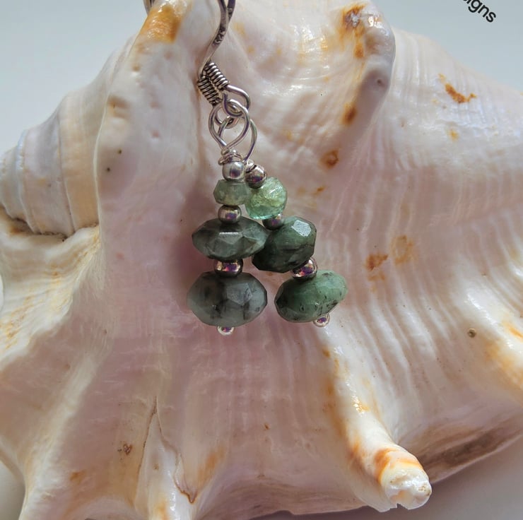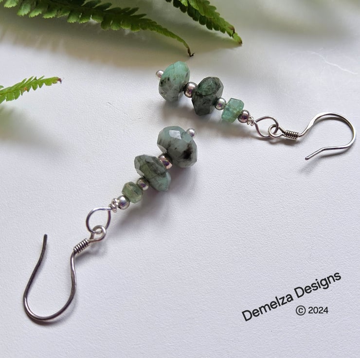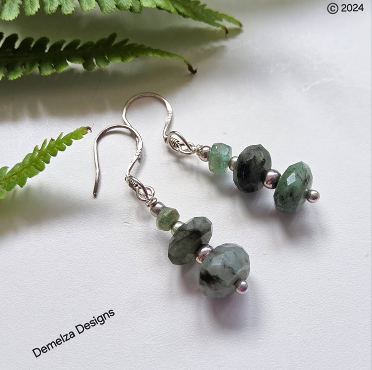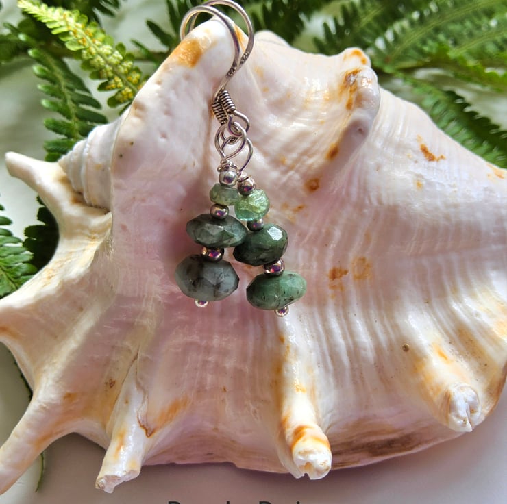 These sweet dainty genuine natural untreated emerald earrings have been designed and hand crafted in Cornwall using graduating in size free faceted rondelle cut gemstones beads.