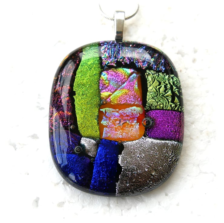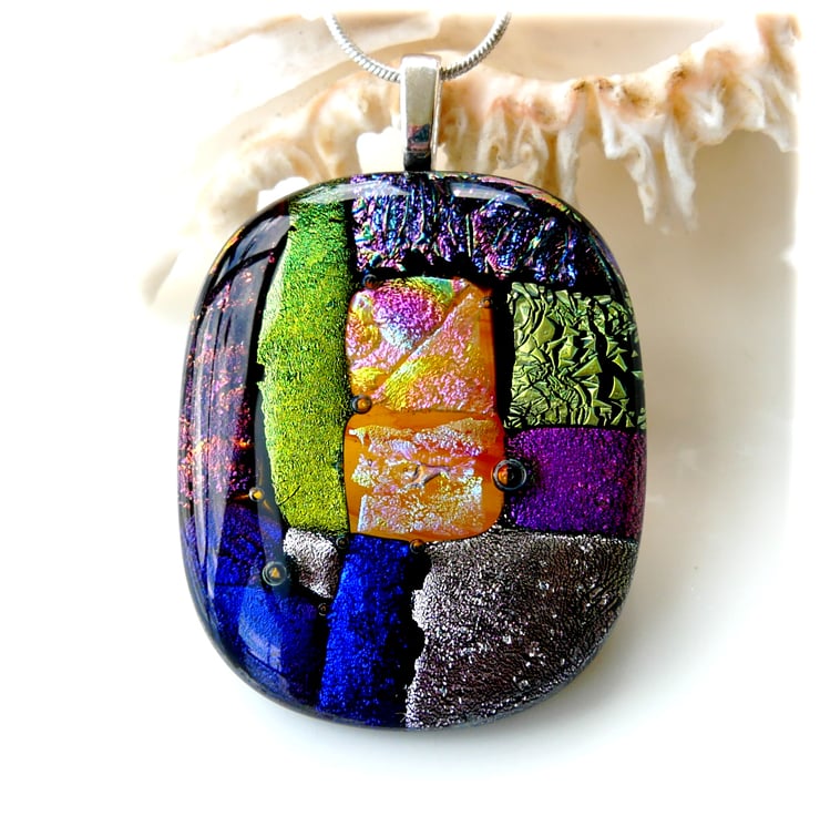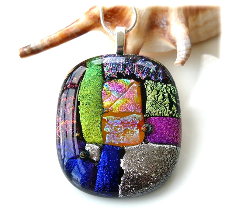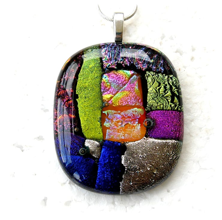 The patchwork dichroic 3 layer glass cabochons for my pendants are all unique and handmade, by me, with love.