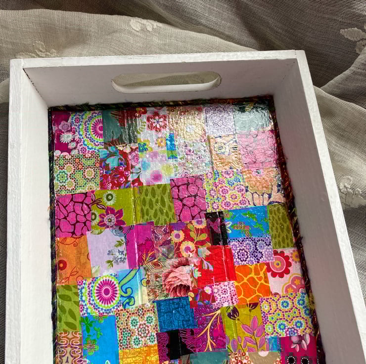 This white wooden decopatch tray is a pretty addition to brighten up a room.