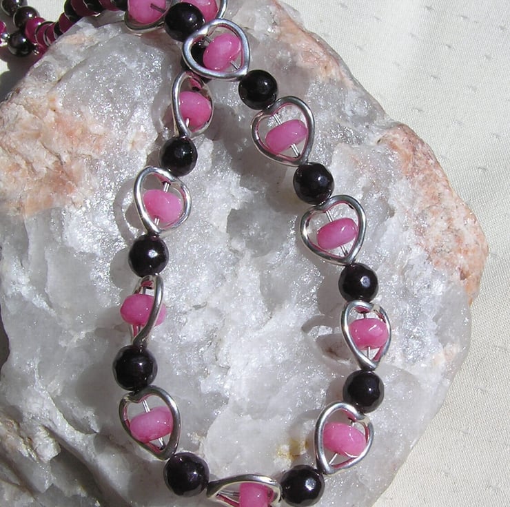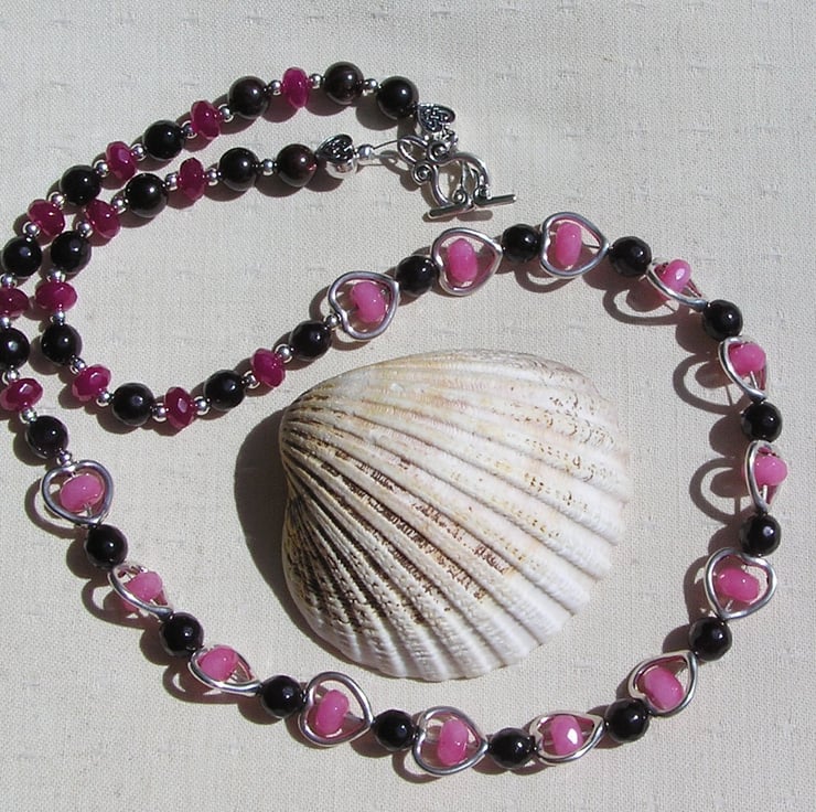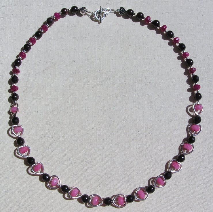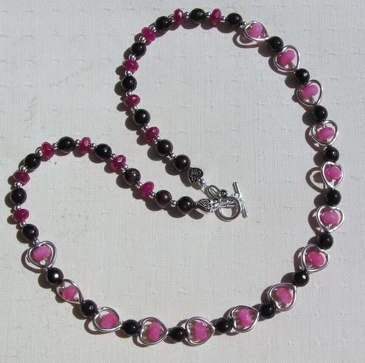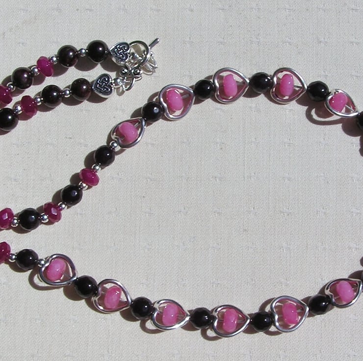 The Central swathe of this Stunning Necklace is made from alternating Deep Red Garnet faceted round beads and Pink Morganite rondelle beads… which are floating/suspended inside Tibetan Silver Heart Frames – this then flows into more of the Deep red Garnet beads this time alternated with Bright Pink Ruby rondelle beads with a Tibetan Silver Celtic Heart at each end… A Celebration of Rinks & Red that will look stunning for either the casual look or wear it with something more Elegant for a Special Evening out