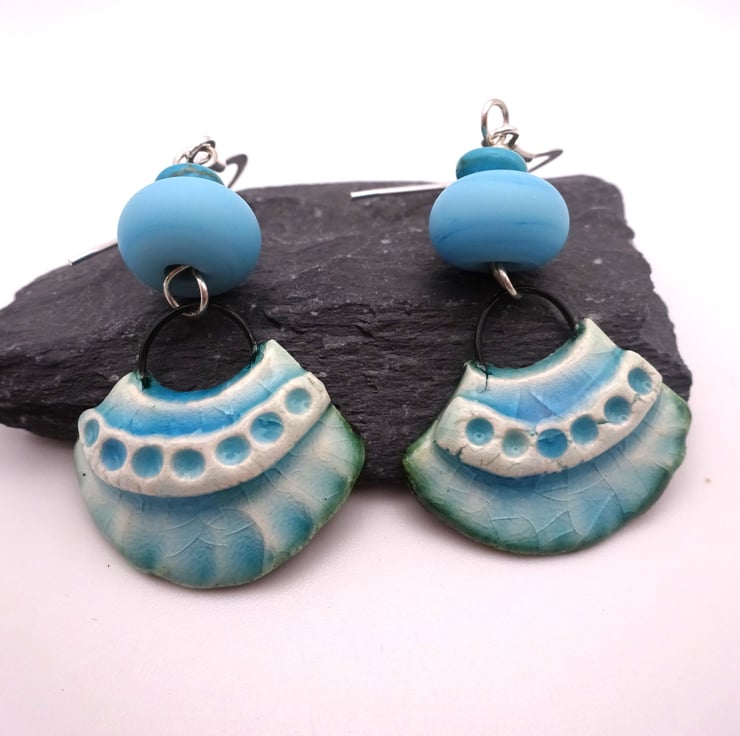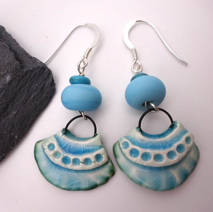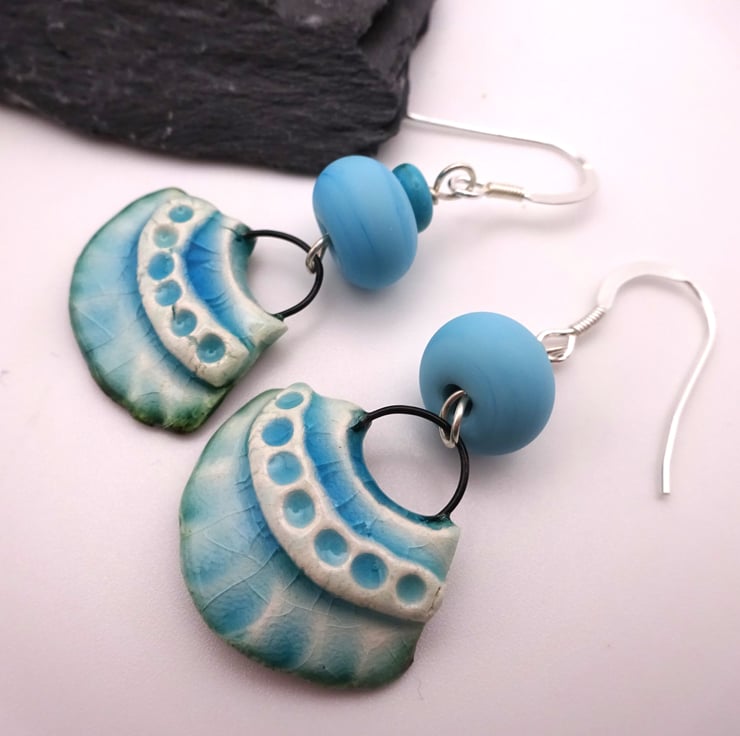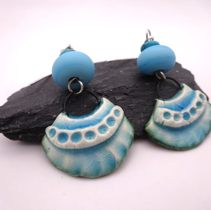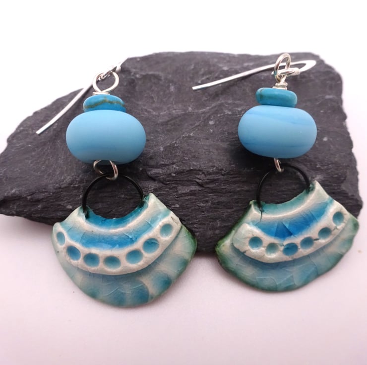 A pair of earrings made with sterling silver ear wires, handmade blue lampwork glass beads and handmade ceramic fan shaped charms with a blue glaze.
