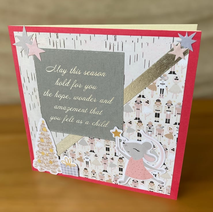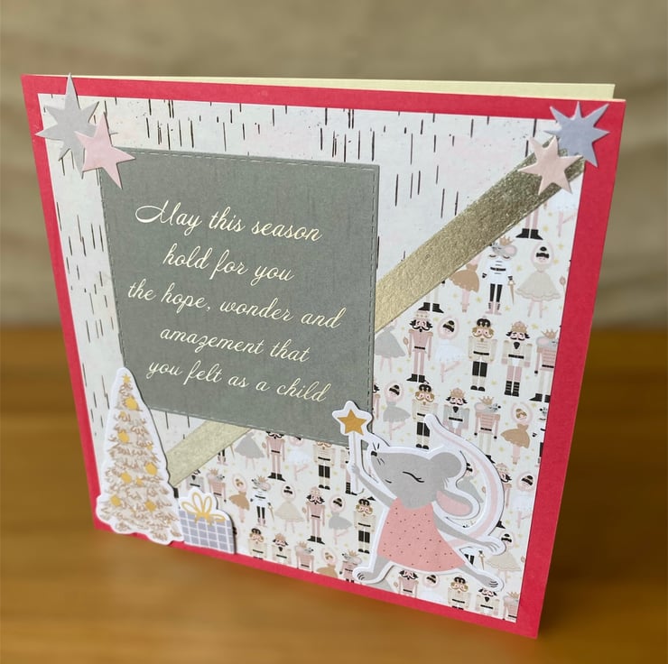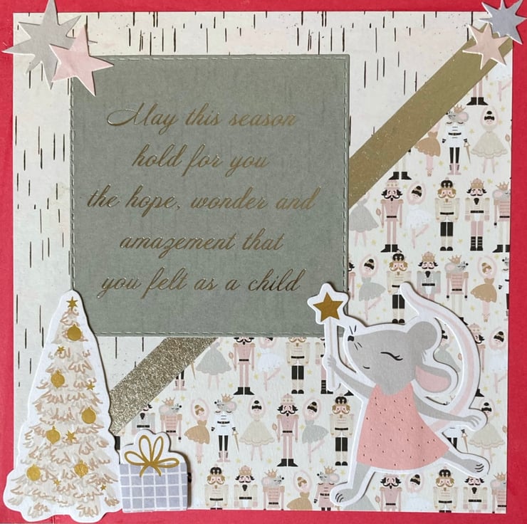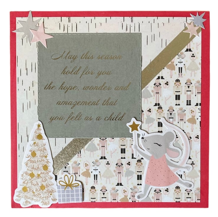 Christmas themed paper has been layered onto a bright pink background. Little embellishments with a mouse, Christmas tree and gifts have been added. A lovely message in sliver on a grey background features.