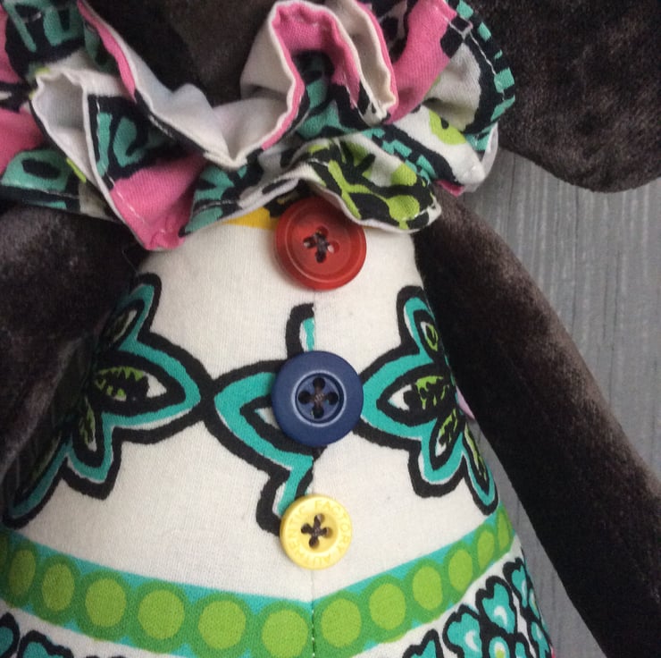 He has long floppy ears and a black velvety covered safety nose and beautiful brown safety eyes. His body is made from multi coloured cotton material with three coloured buttons in red, blue and yellow.