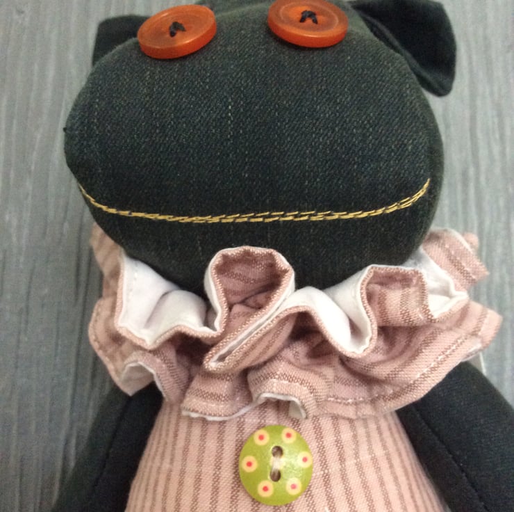 His body is made from pink stripe coloured cotton material with three coloured buttons down the front.