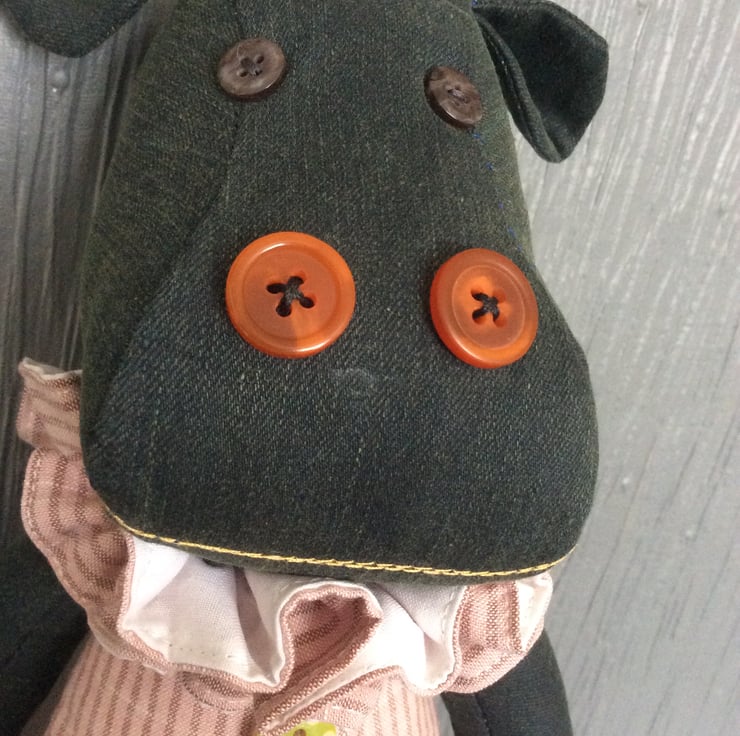 Harriett is a happy Hippo doll who would love to come home with you. She is hand made with love in a dark grey canvas. She has black button eyes with button nostrils and wide stitched smilely mouth.