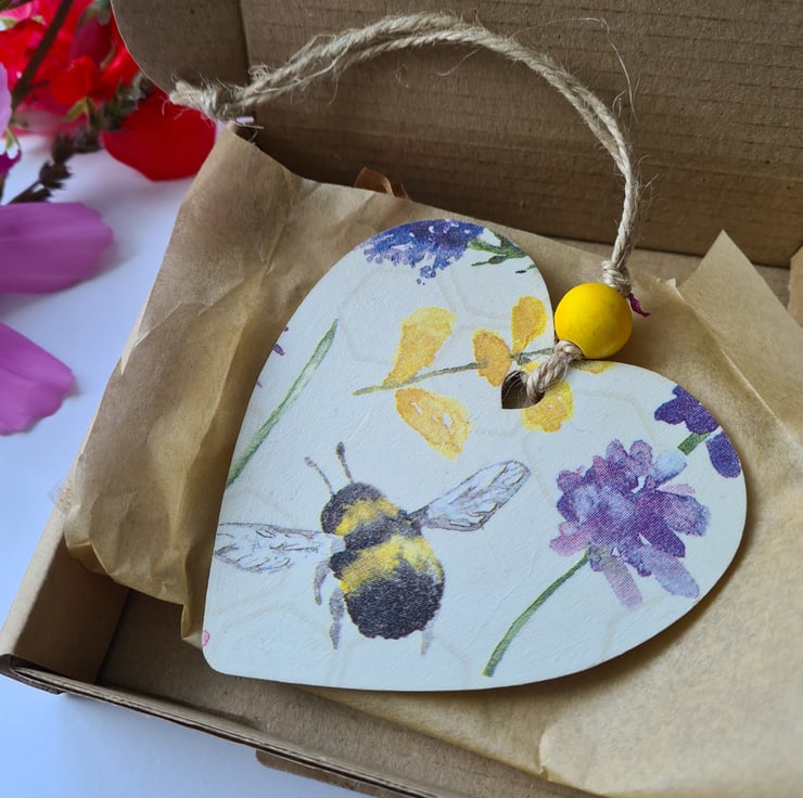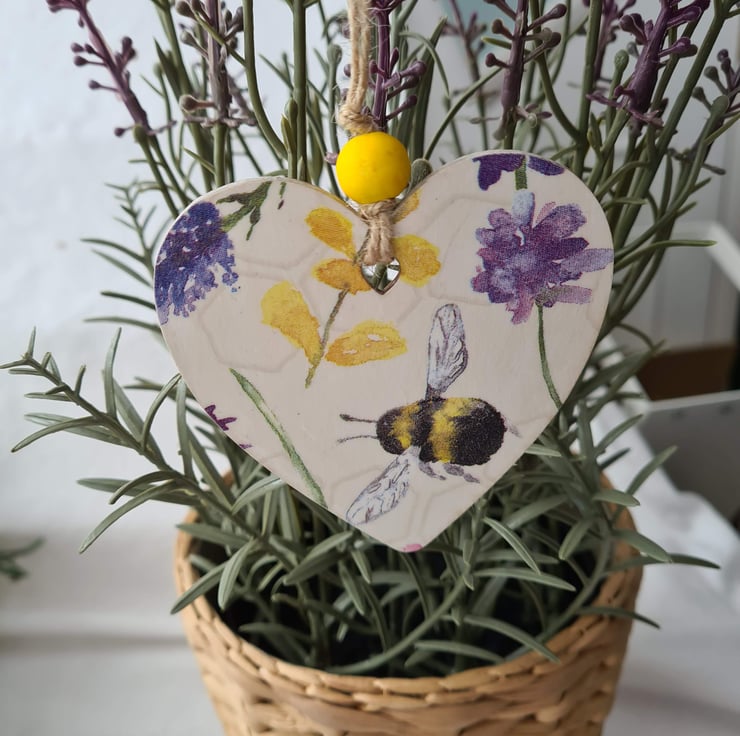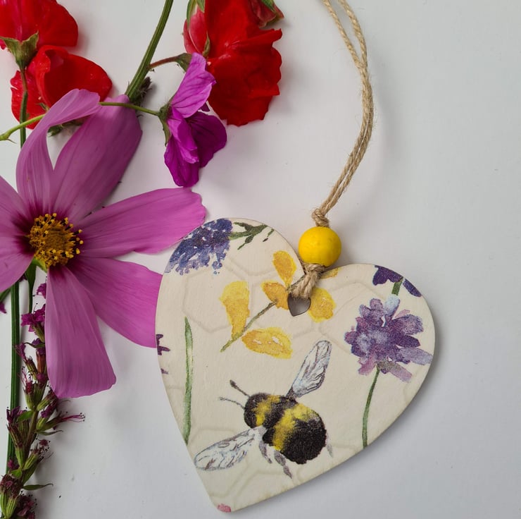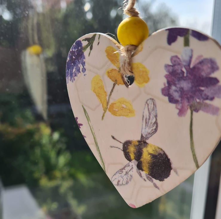 This wooden hanging decoration has been decorated with decoupage using a pretty bee and flower design paper napkin. It has been sealed and finished with a yellow painted bead and twine. It is unsealed on the back.