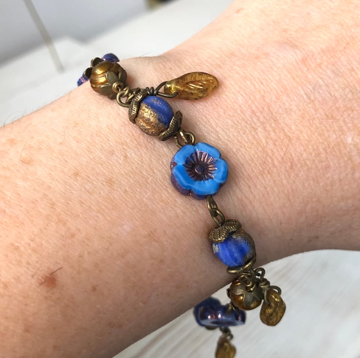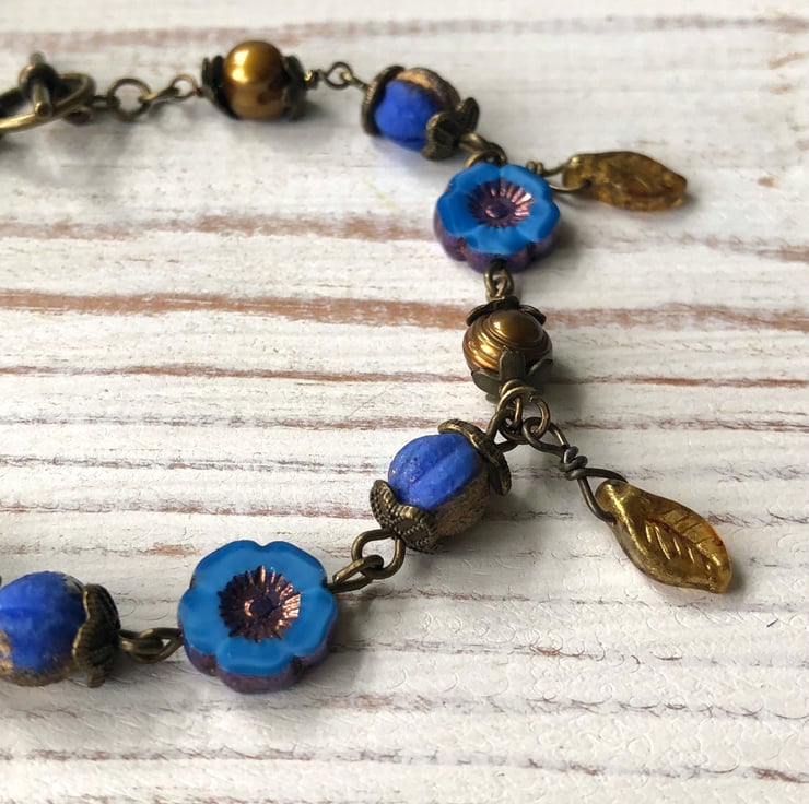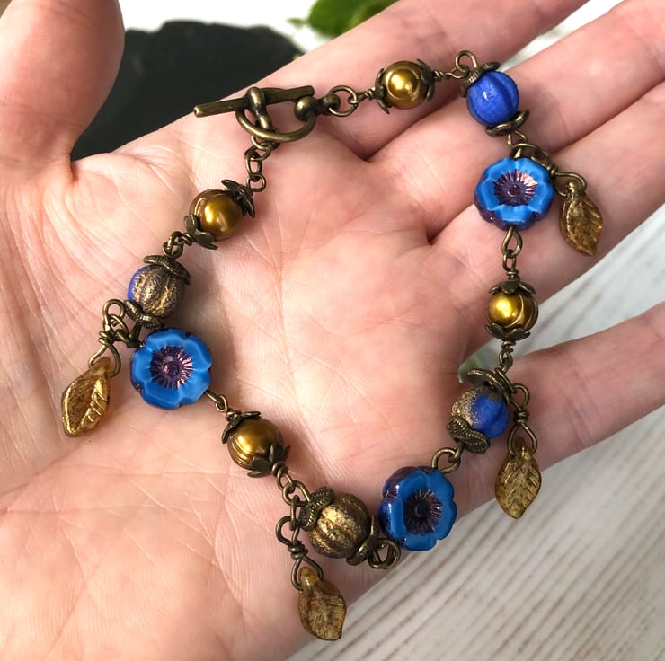 A lovely jangly Bohemian beaded bracelet with 11mm vivid blue Czech glass flowers, blue Czech Glass melon beads (with a gold patina), gold Czech glass leaves and gold freshwater baroque pearls. I have wire wrapped all of these with bronze tone wire to form a beaded chain bracelet and finished the bracelet with bronze tone toggle clasp.