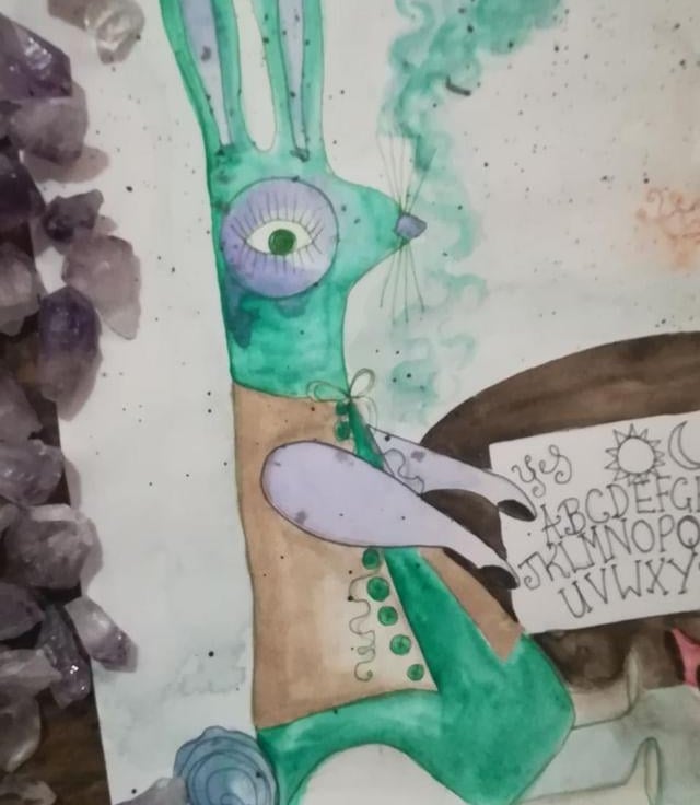 A Ouija, Sceance scene inhabited by anthropomorphic characters,